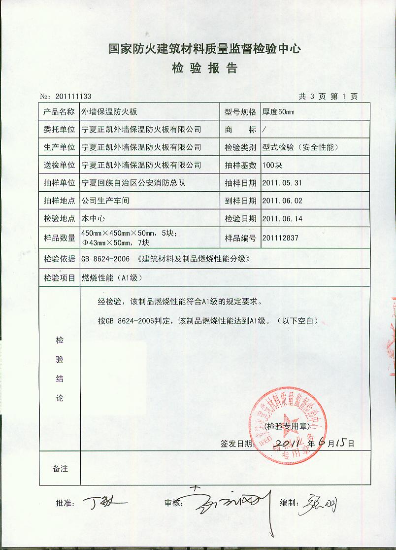 经检验,该制品燃烧性能符合A1级的规定要求。按GB 8624-2006判定,该制品燃烧性能达到A1级。(以下空白)