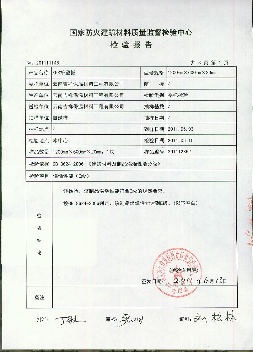 经检验,该制品燃烧性能符合E级的规定要求。 按GB 8624-2006判定,该制品燃烧性能达到E级。(以下空白)