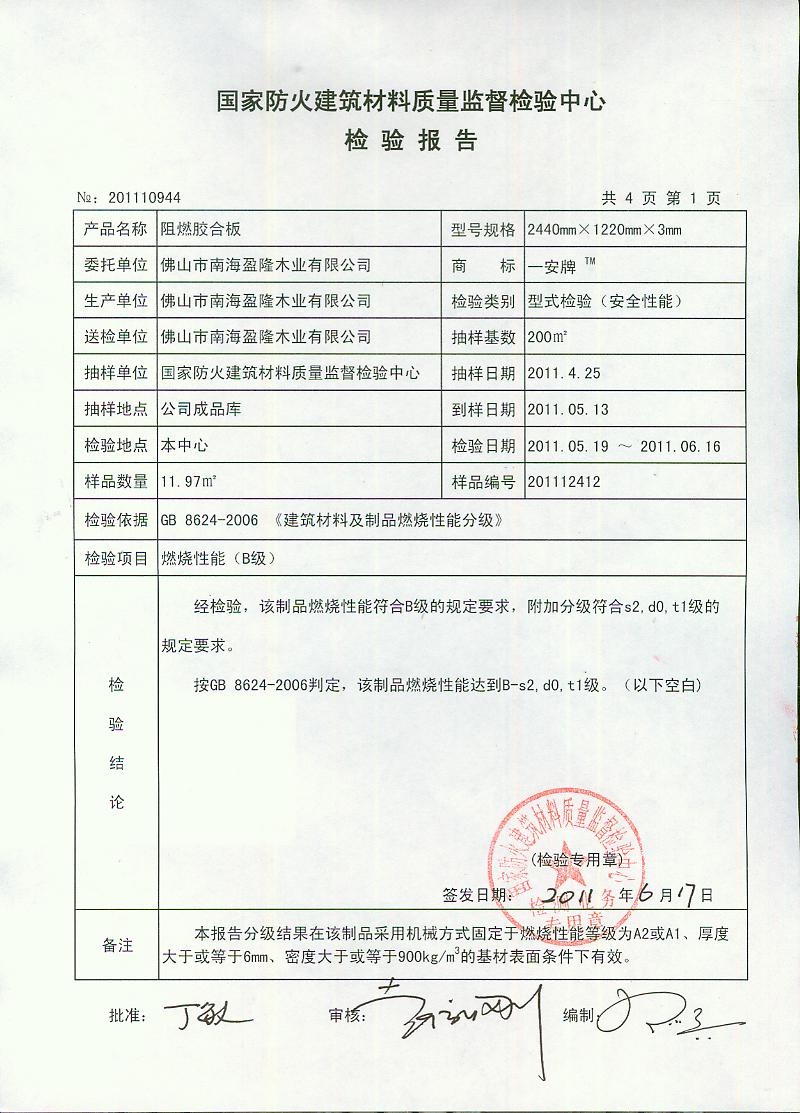 经检验,该制品燃烧性能符合B级的规定要求,附加分级符合s1,d0,t1级的规定要求。 按GB 8624-2006判定,该制品燃烧性能达到B-s1,d0,t1级。(以下空白)