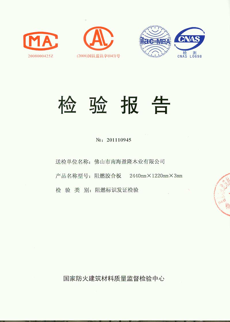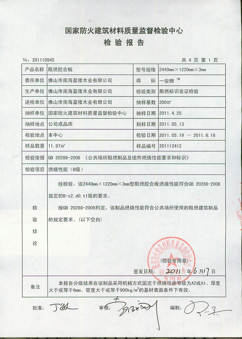 经检验,该2440mm×1220mm×3mm型阻燃胶合板燃烧性能符合GB 20286-2006规定的B-s2,d0,t1级的要求。 按GB 20286-2006判定,该制品燃烧性能符合公共场所使用的阻燃建筑制品的规定要求。(以下空白)
