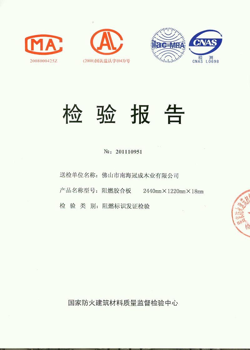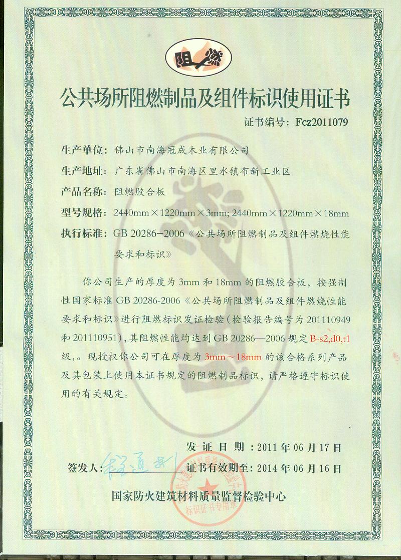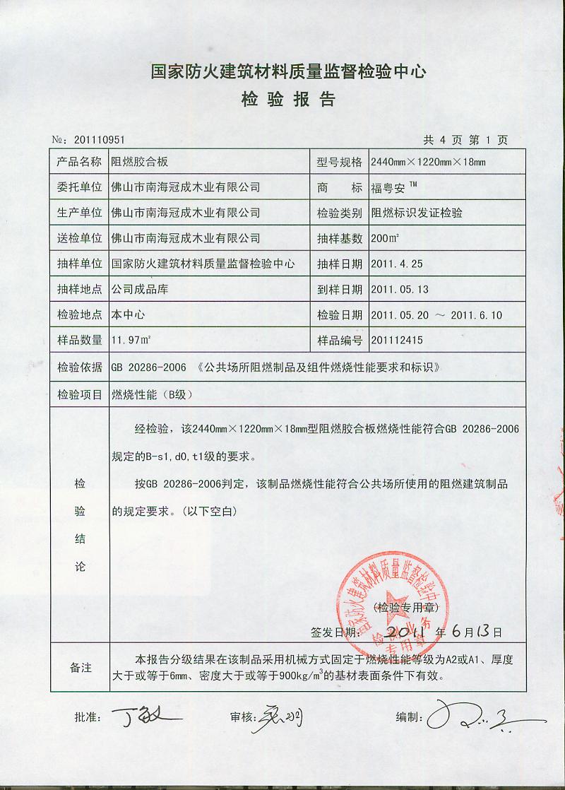 经检验,该2440mm×1220mm×18mm型阻燃胶合板燃烧性能符合GB 20286-2006规定的B-s1,d0,t1级的要求。 按GB 20286-2006判定,该制品燃烧性能符合公共场所使用的阻燃建筑制品的规定要求。(以下空白)