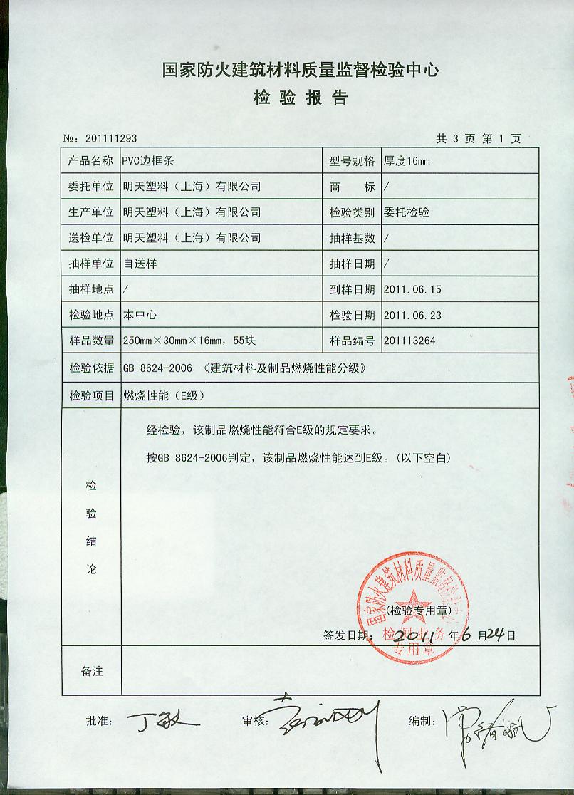 经检验,该制品燃烧性能符合E级的规定要求。 按GB 8624-2006判定,该制品燃烧性能达到E级。(以下空白)