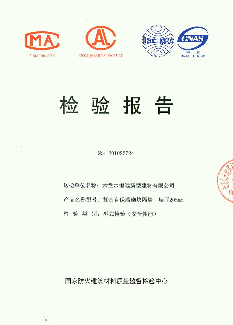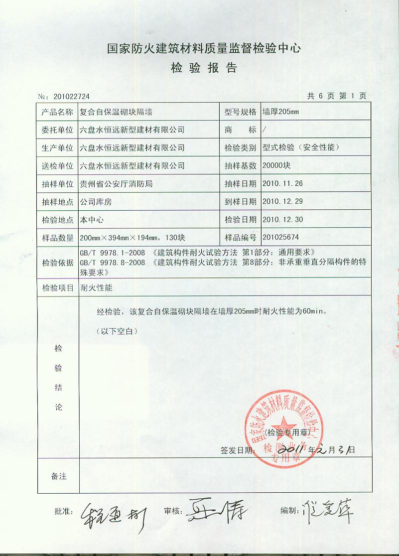 经检验,该复合自保温砌块隔墙在墙厚205mm时耐火性能为60min。 (以下空白)