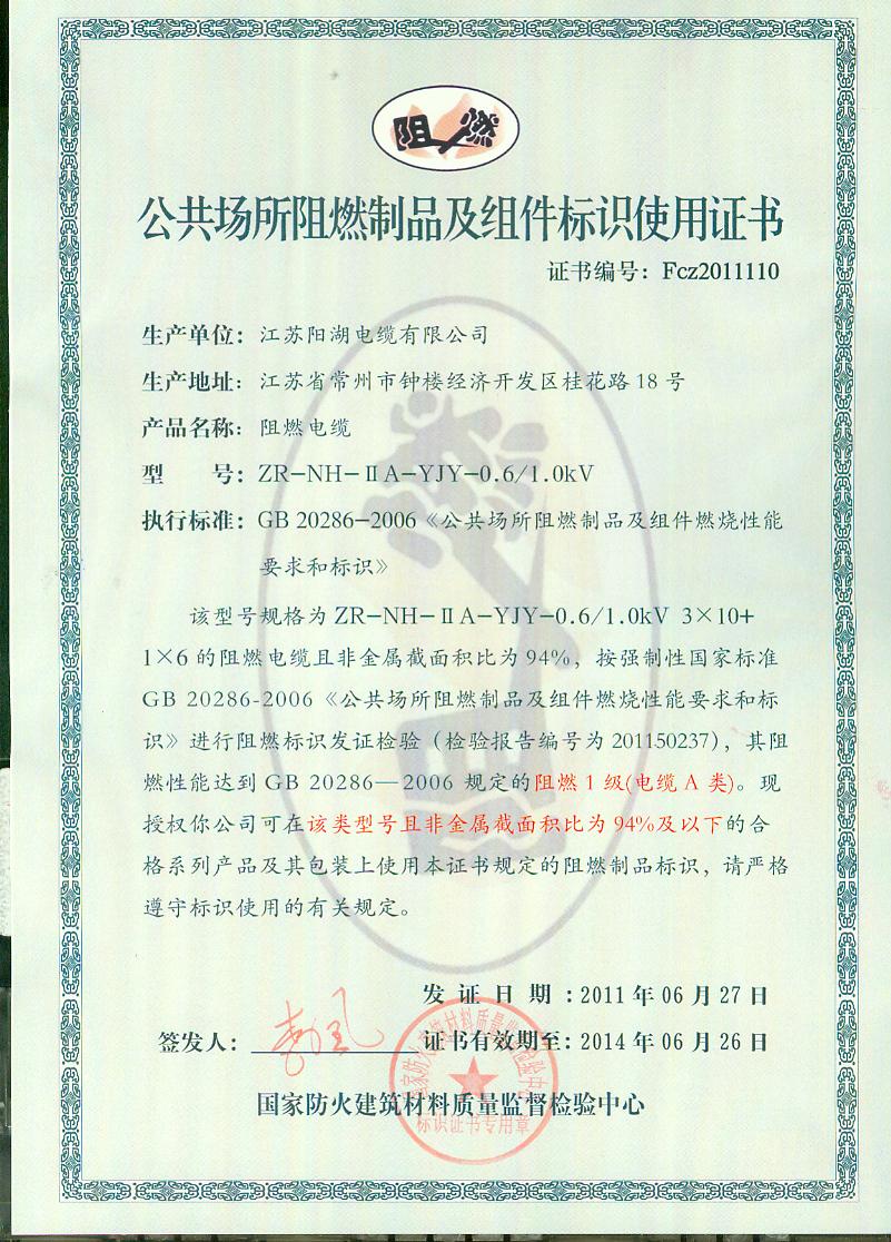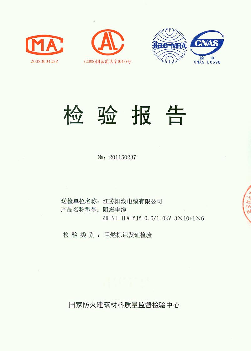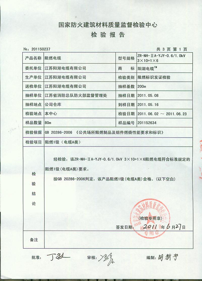 经检验,该ZR-NH-ⅡA-YJY-0.6/1.0kV 3×10+1×6阻燃电缆符合标准规定的阻燃1级(电缆A类)要求。 按GB 20286-2006判定,该产品阻燃1级(电缆A类)合格。(以下空白)