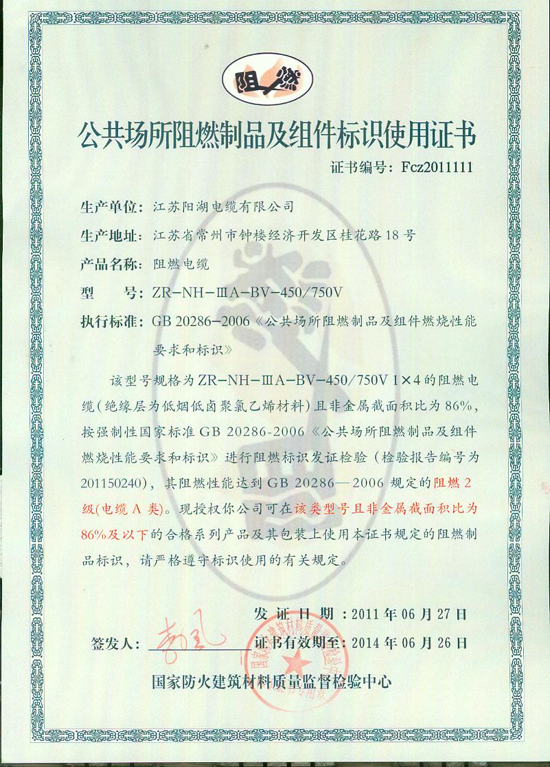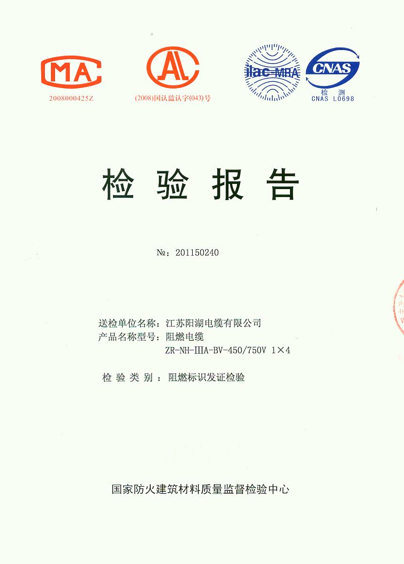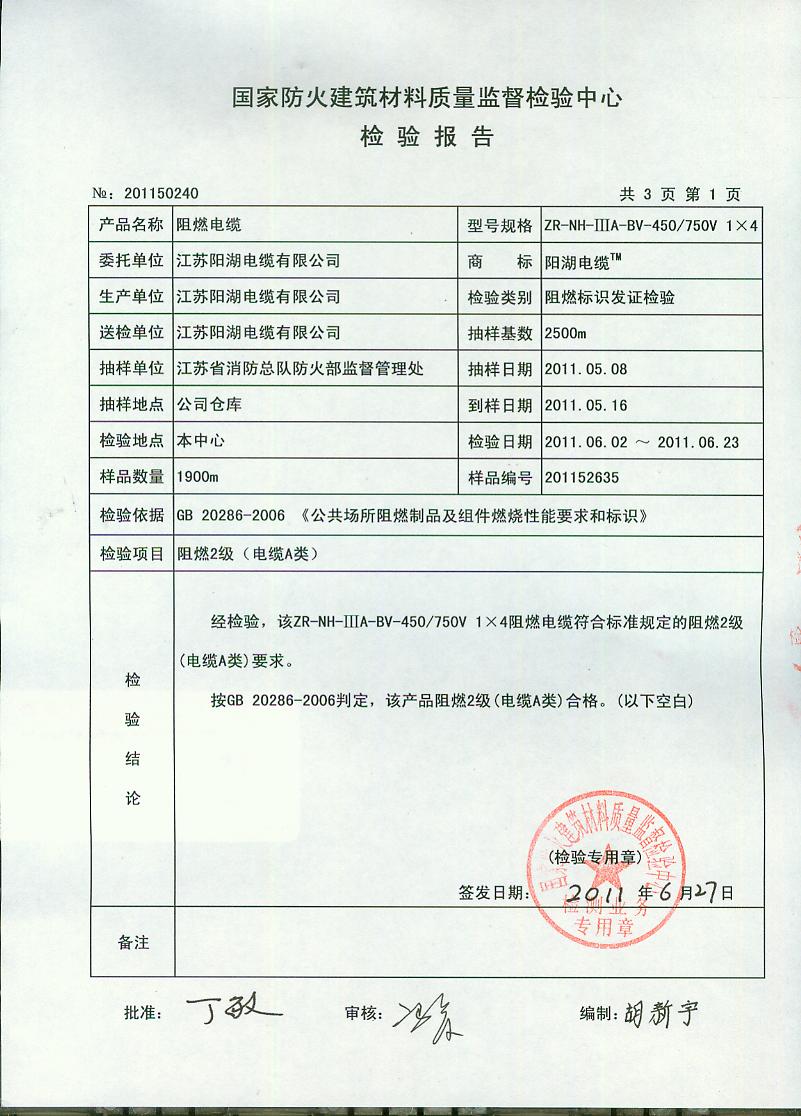 经检验,该ZR-NH-ⅢA-BV-450/750V 1×4阻燃电缆符合标准规定的阻燃2级(电缆A类)要求。 按GB 20286-2006判定,该产品阻燃2级(电缆A类)合格。(以下空白)