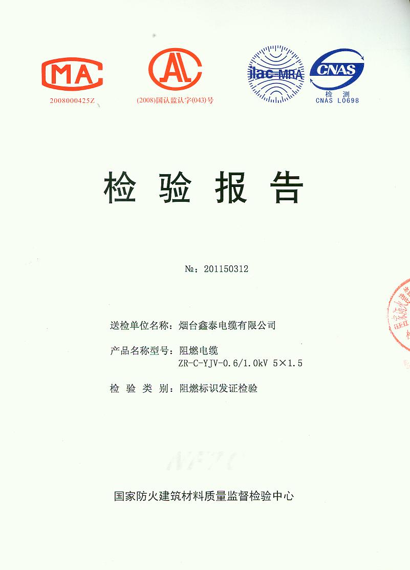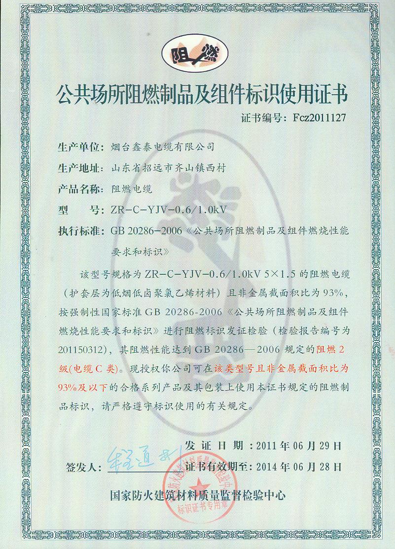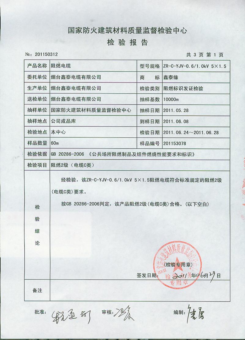 经检验,该ZR-C-YJV-0.6/1.0kV 5×1.5阻燃电缆符合标准规定的阻燃2级(电缆C类)要求。 按GB 20286-2006判定,该产品阻燃2级(电缆C类)合格。(以下空白)