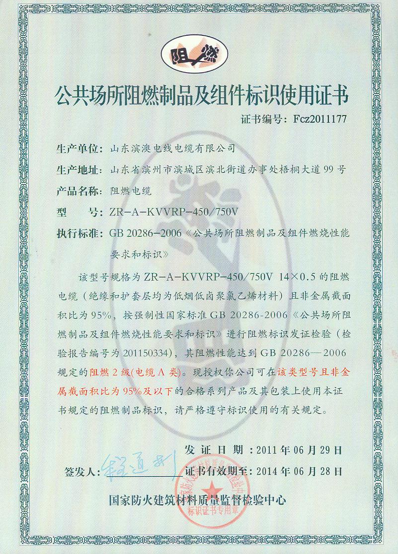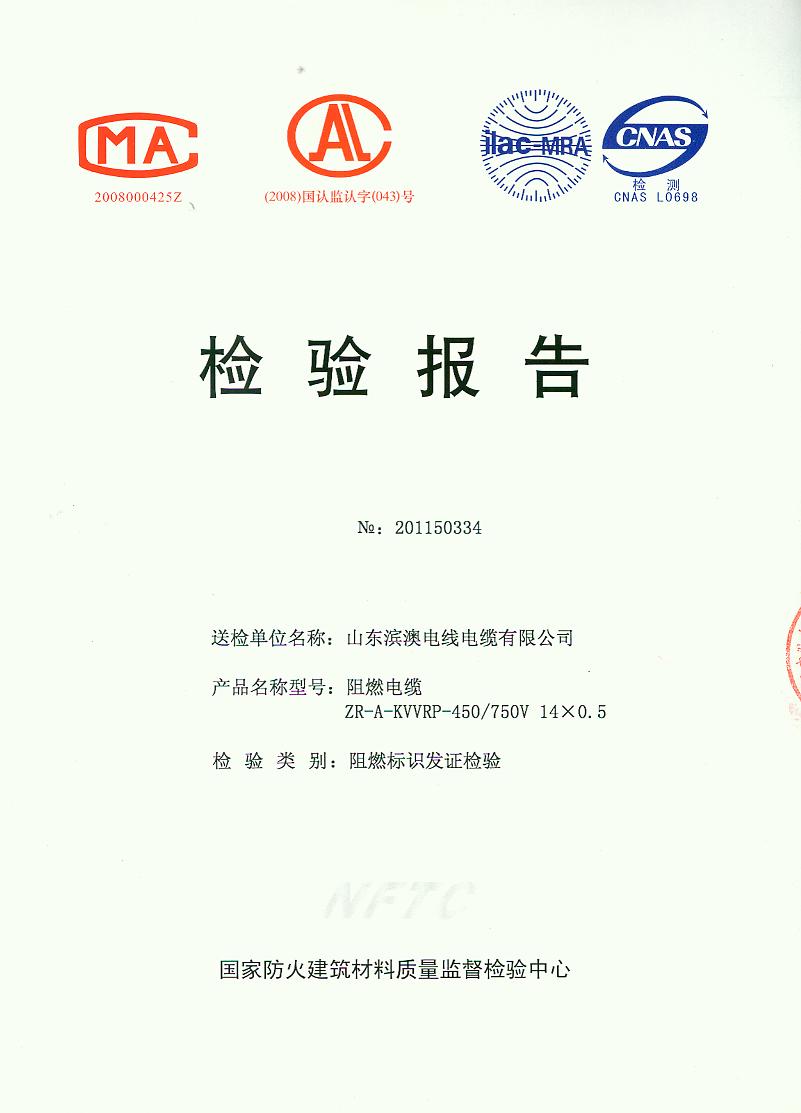 经检验,该ZR-A-KVVRP-450/750V 14×0.5阻燃电缆符合标准规定的阻燃2级(电缆A类)要求。 按GB 20286-2006判定,该产品阻燃2级(电缆A类)合格。(以下空白)