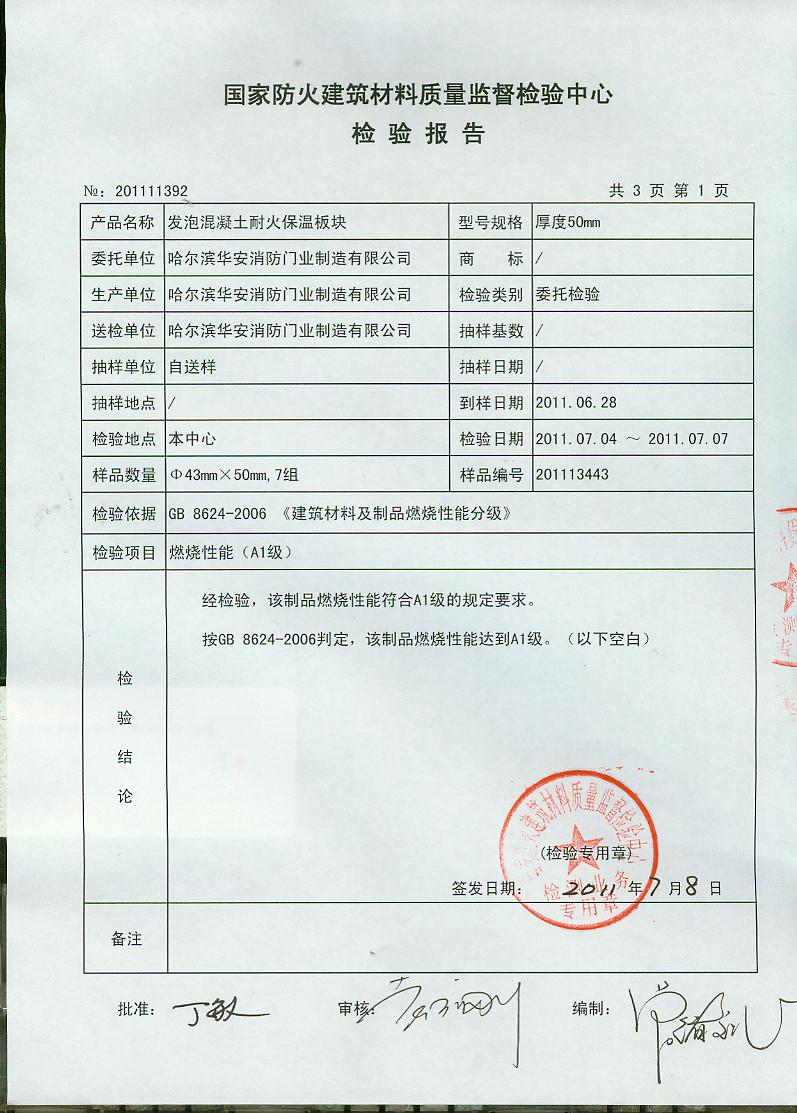 经检验,该制品燃烧性能符合A1级的规定要求。按GB 8624-2006判定,该制品燃烧性能达到A1级。(以下空白)