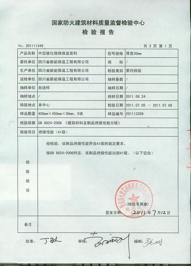 经检验,该制品燃烧性能符合A1级的规定要求。按GB 8624-2006判定,该制品燃烧性能达到A1级。(以下空白)