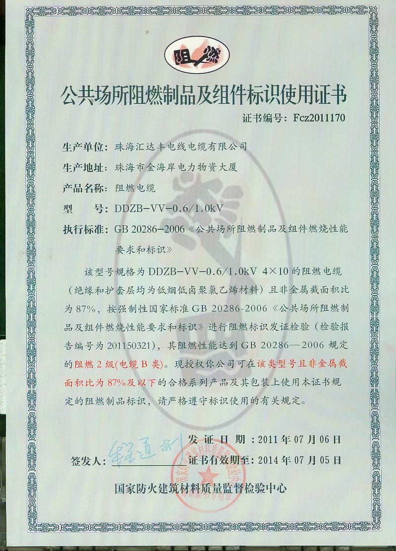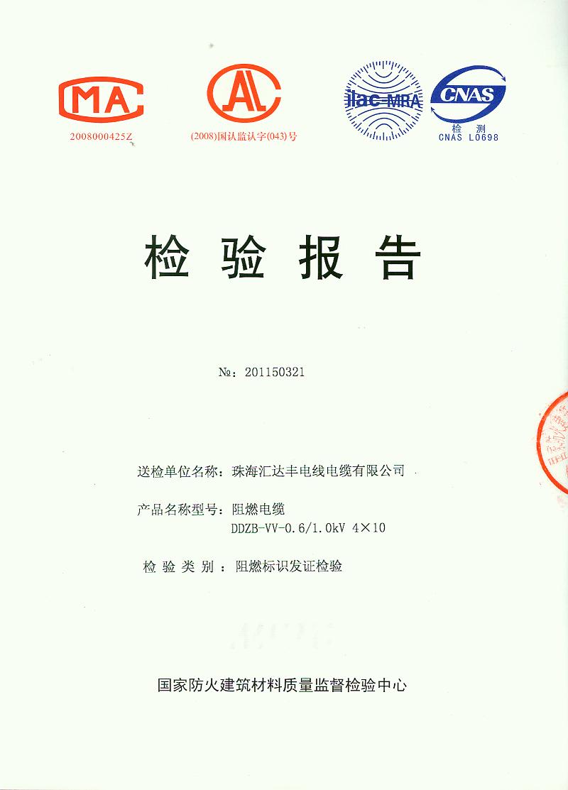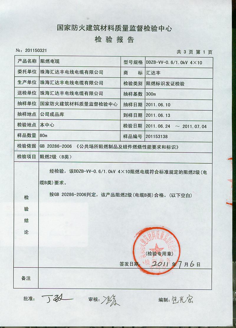 经检验,该DDZB-VV-0.6/1.0kV 4×10阻燃电缆符合标准规定的阻燃2级(电缆B类)要求。 按GB 20286-2006判定,该产品阻燃2级(电缆B类)合格。(以下空白)