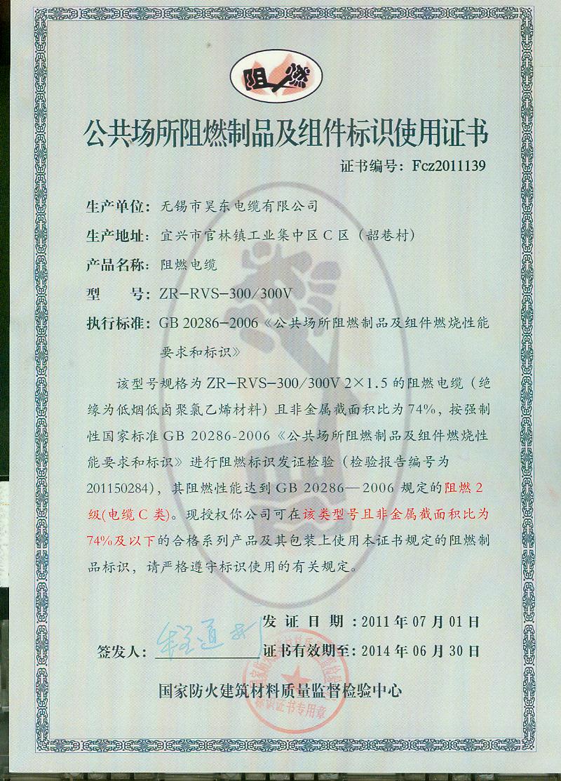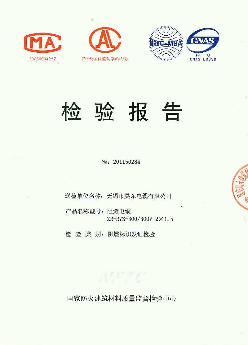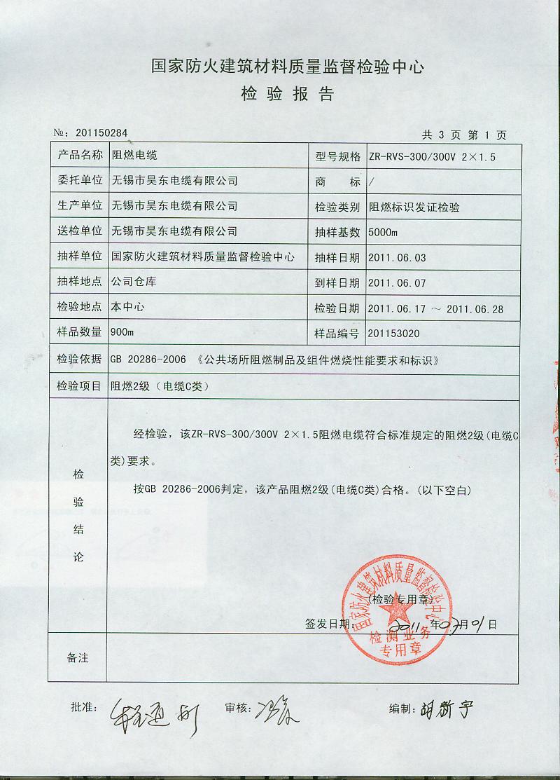 经检验,该ZR-B-RVS-300/300V 2×1.5阻燃电缆符合标准规定的阻燃2级(电缆C类)要求。 按GB 20286-2006判定,该产品阻燃2级(电缆C类)合格。(以下空白)