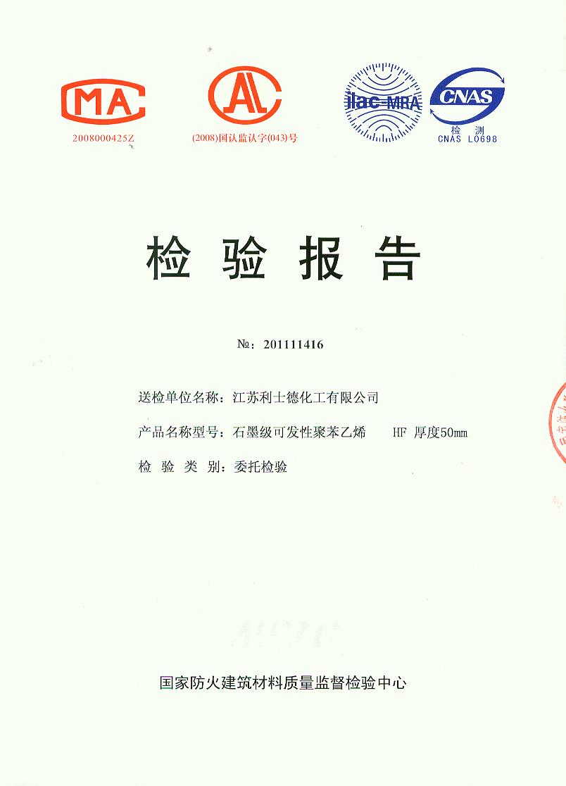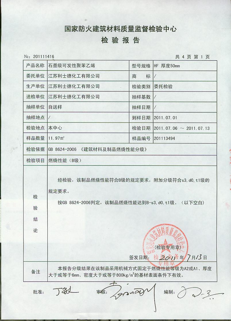 经检验,该制品燃烧性能符合B级的规定要求,附加分级符合s3,d0,t1级的规定要求。 按GB 8624-2006判定,该制品燃烧性能达到B-s3,d0,t1级。(以下空白)