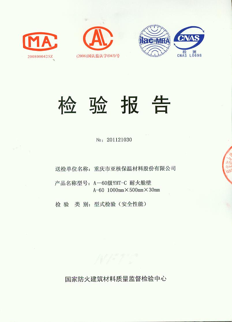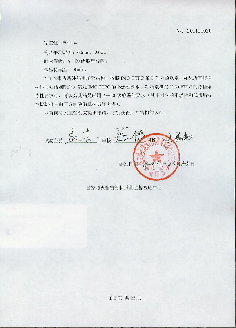 该试样符合经修正的《1974年国际海上人命安全公约》(SOLAS)船舶结构防火的有关要求。
