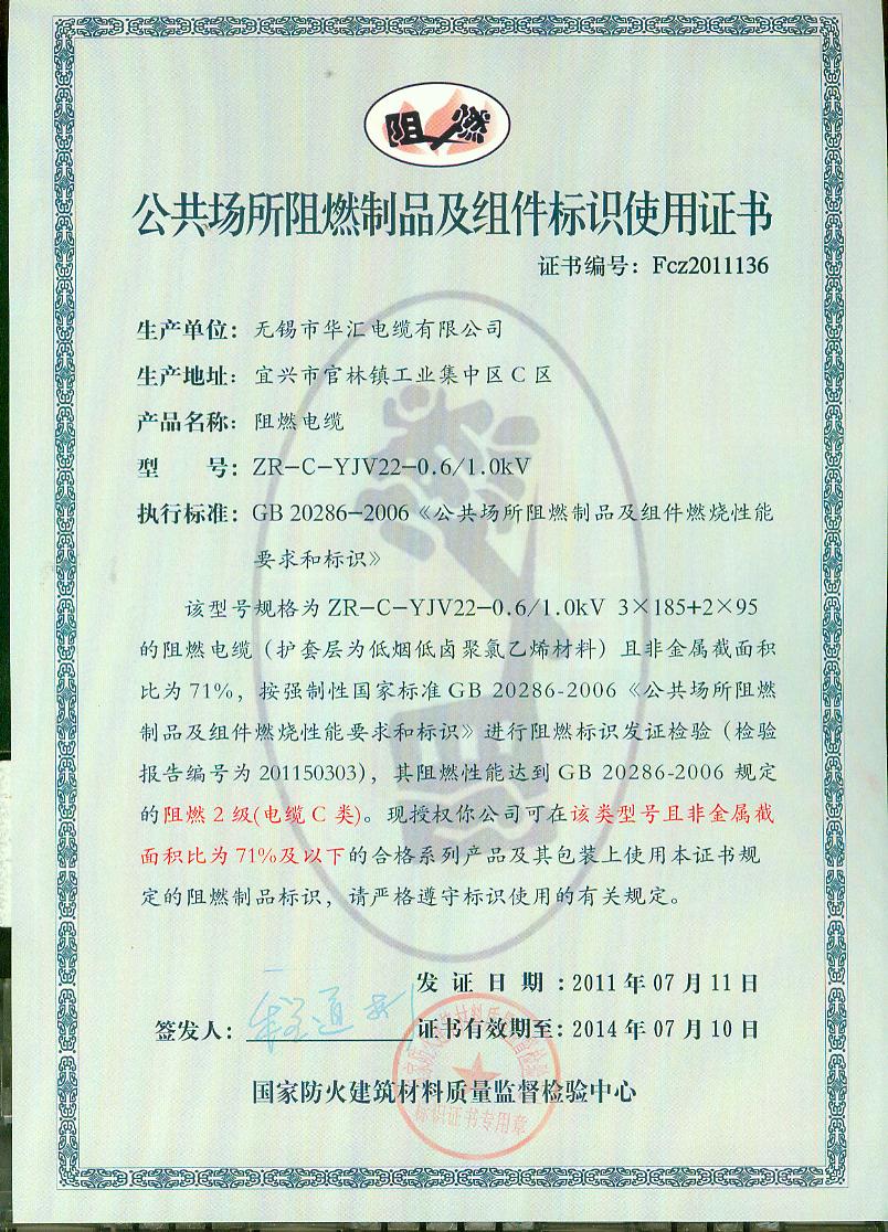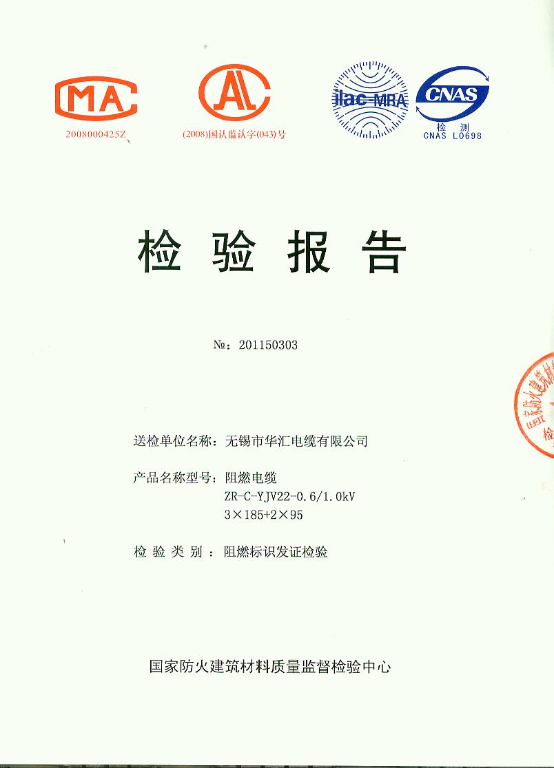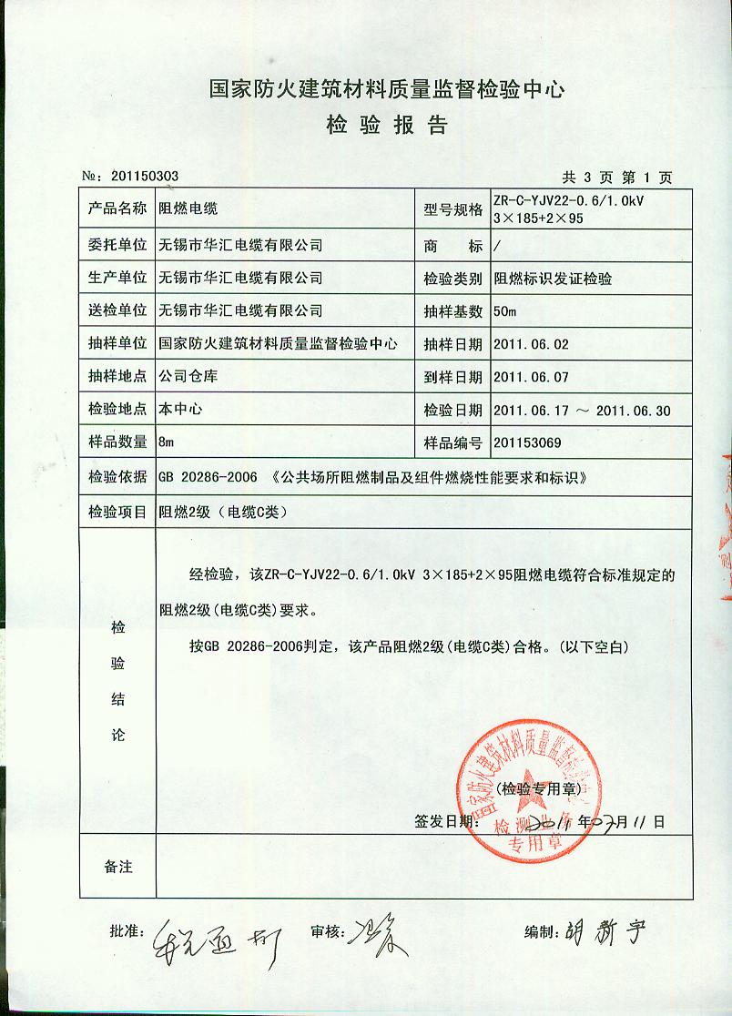 经检验,该ZR-C-YJV22-0.6/1.0kV 3×185+2×95阻燃电缆符合标准规定的阻燃2级(电缆C类)要求。 按GB 20286-2006判定,该产品阻燃2级(电缆C类)合格。(以下空白)