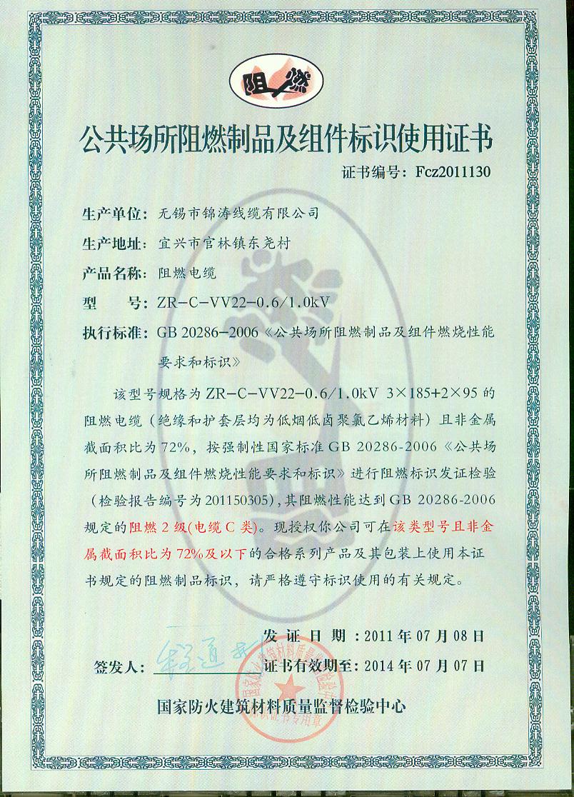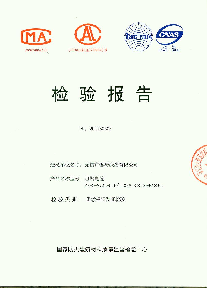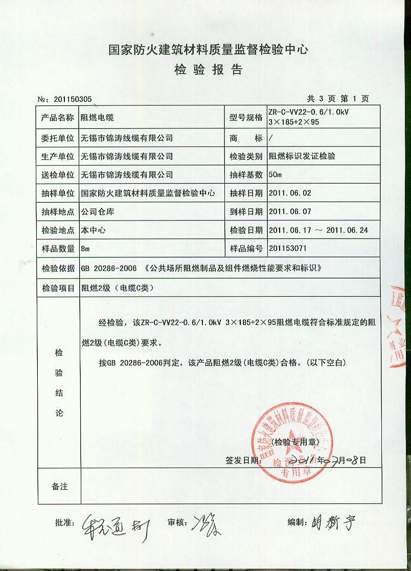 经检验,该ZR-C-VV22-0.6/1.0kV 3×185+2×95阻燃电缆符合标准规定的阻燃2级(电缆C类)要求。 按GB 20286-2006判定,该产品阻燃2级(电缆C类)合格。(以下空白)