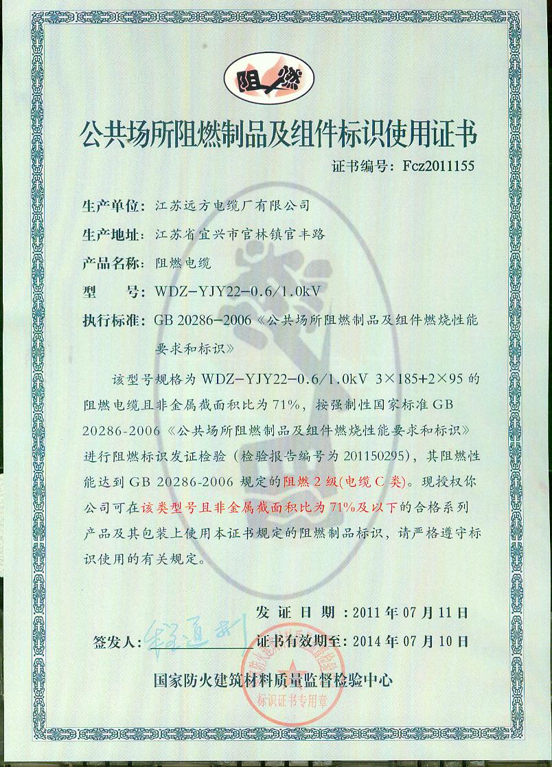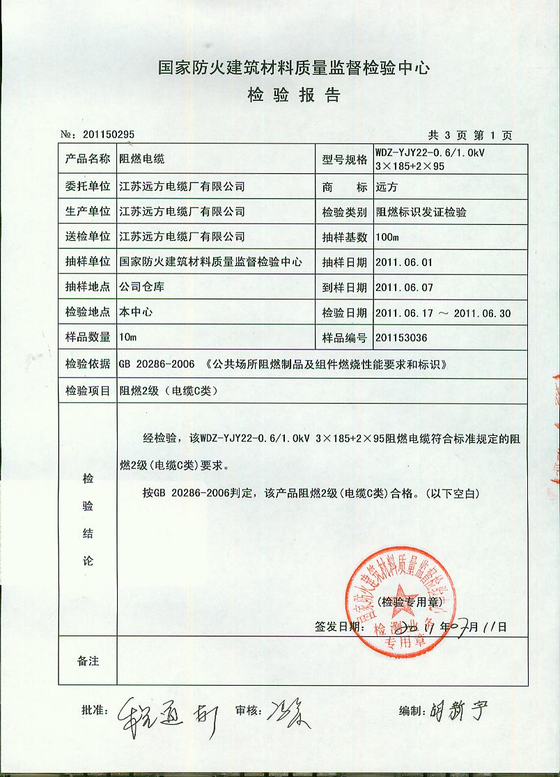 经检验,该WDZ-YJY22-0.6/1.0kV 3×185+2×95阻燃电缆符合标准规定的阻燃2级(电缆C类)要求。 按GB 20286-2006判定,该产品阻燃2级(电缆C类)合格。(以下空白)