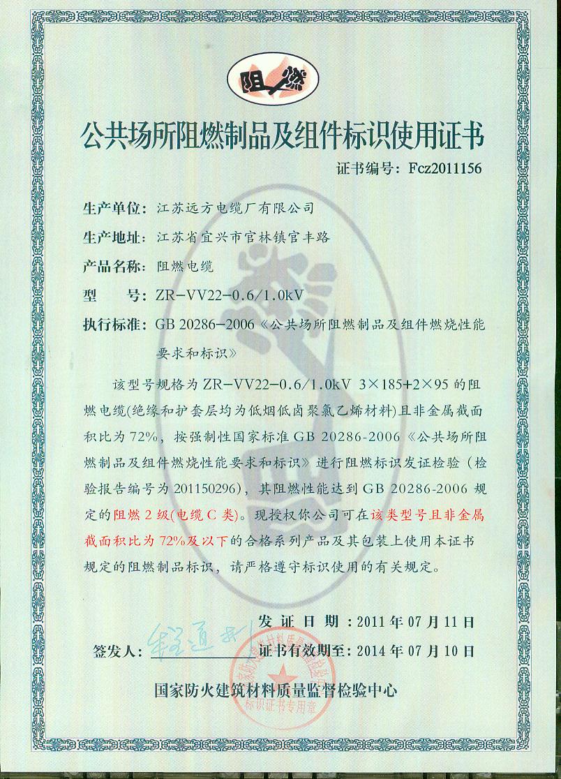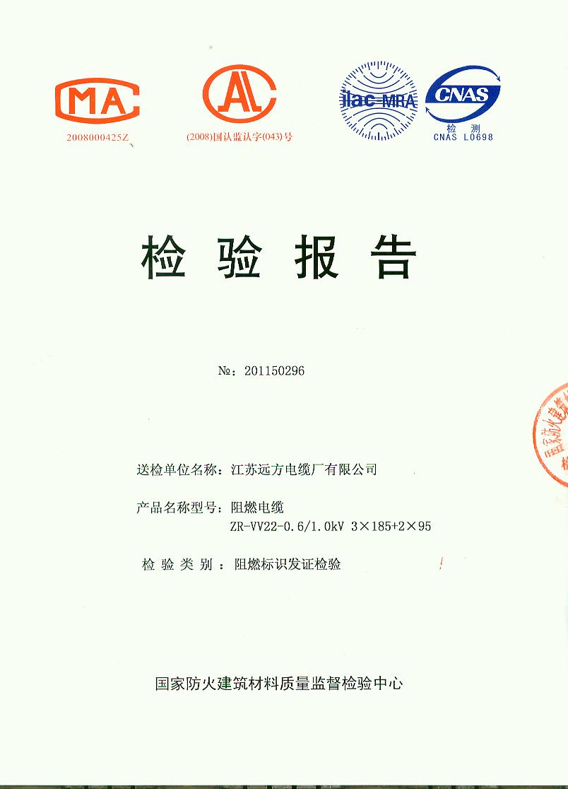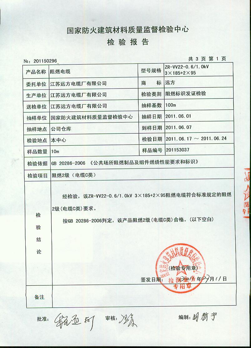 经检验,该ZR-VV22-0.6/1.0kV 3×185+2×95阻燃电缆符合标准规定的阻燃2级(电缆C类)要求。 按GB 20286-2006判定,该产品阻燃2级(电缆C类)合格。(以下空白)