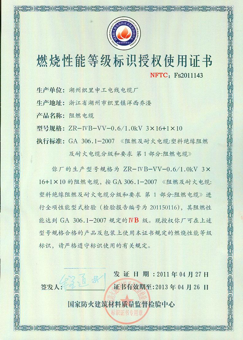 经检验,该ZR-ⅣB-VV-0.6/1.0kV 3×16+1×10阻燃电缆阻燃性能符合ⅣB级规定要求,其它各项技术指标均合格。按GA 306.1-2007综合判定,该产品质量合格。(以下空白)