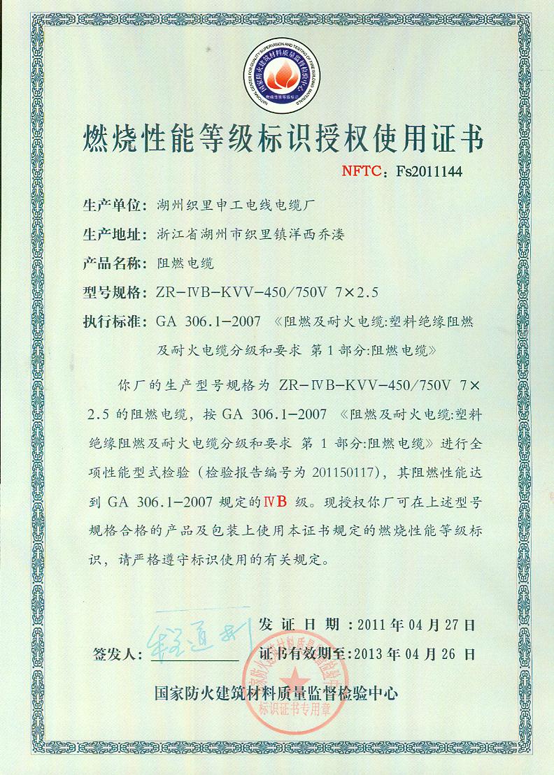 经检验,该ZR-ⅣB-KVV-450/750V 7×2.5阻燃电缆阻燃性能符合ⅣB级规定要求,其它各项技术指标均合格。按GA 306.1-2007综合判定,该产品质量合格。(以下空白)