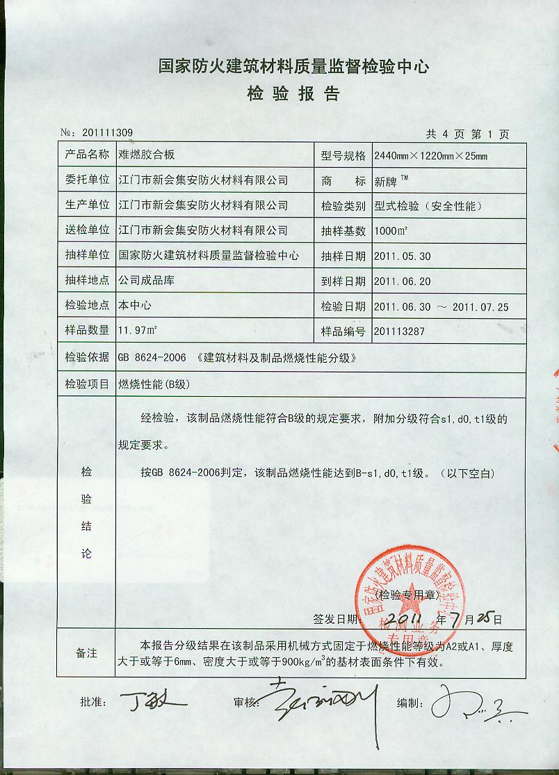 经检验,该制品燃烧性能符合B级的规定要求,附加分级符合s1,d0,t1级的规定要求。 按GB 8624-2006判定,该制品燃烧性能达到B-s1,d0,t1级。(以下空白)