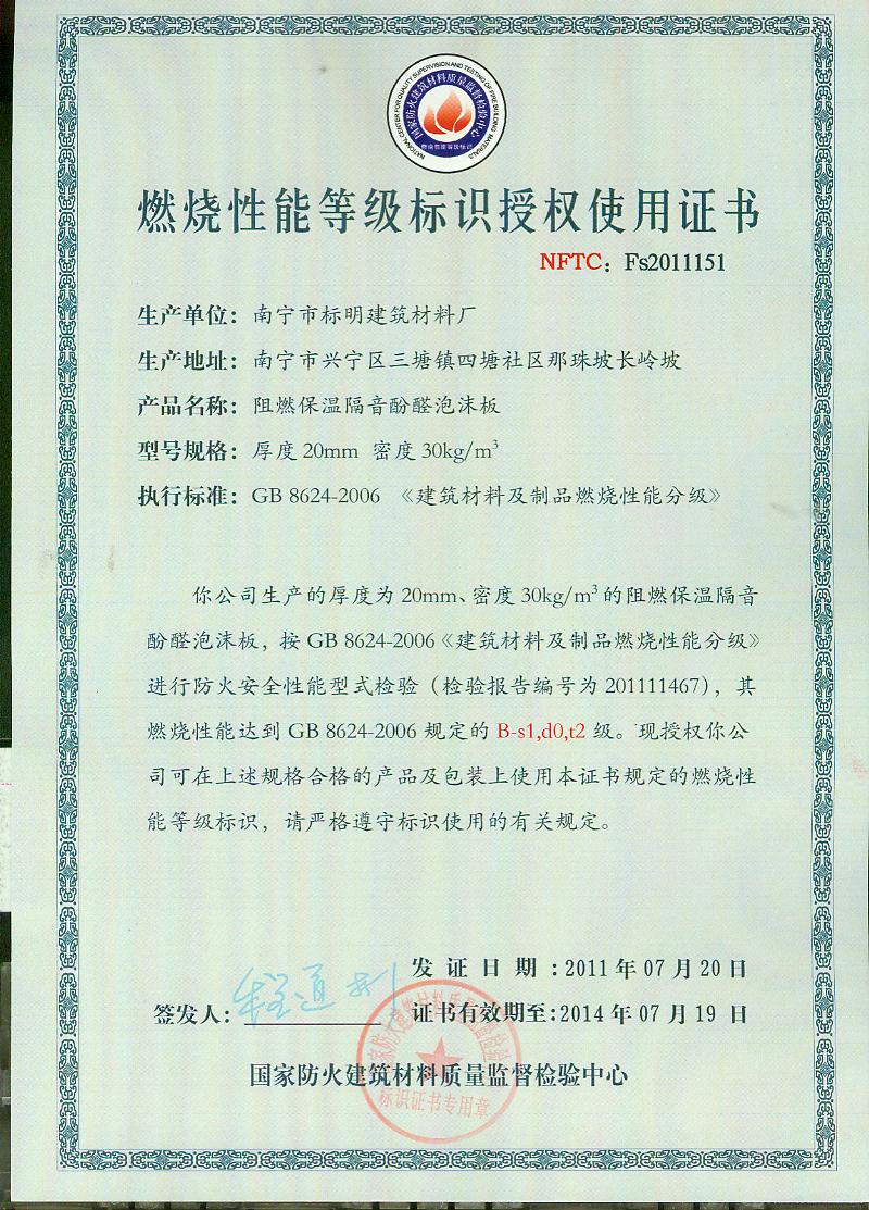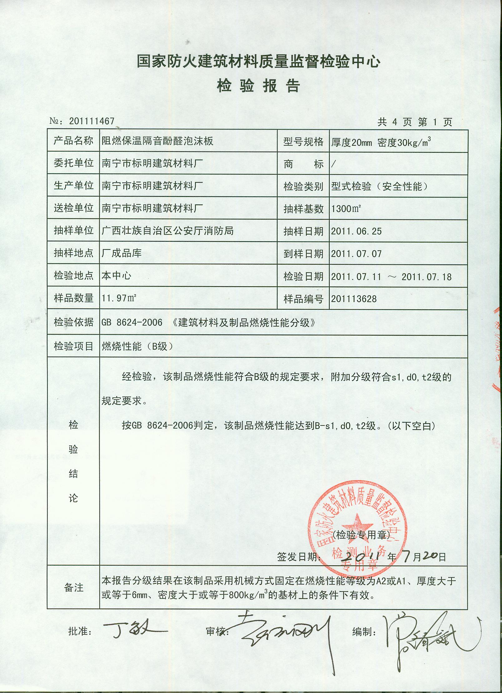 经检验,该制品燃烧性能符合B级的规定要求,附加分级符合s1,d0,t0级的 规定要求。 按GB 8624-2006判定,该制品燃烧性能达到B-s1,d0,t0级。(以下空白)