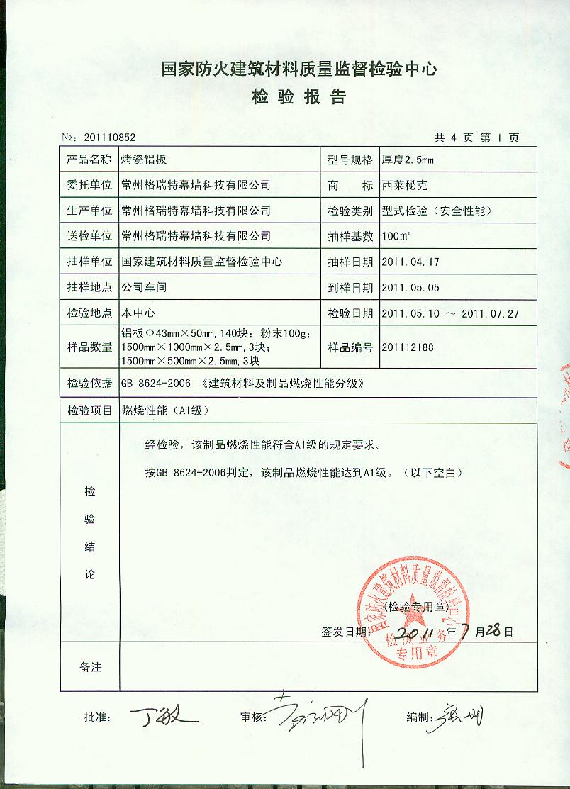 经检验,该制品燃烧性能符合A1级的规定要求。按GB 8624-2006判定,该制品燃烧性能达到A1级。(以下空白)