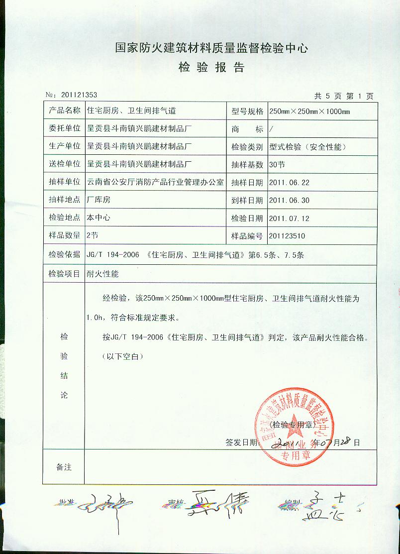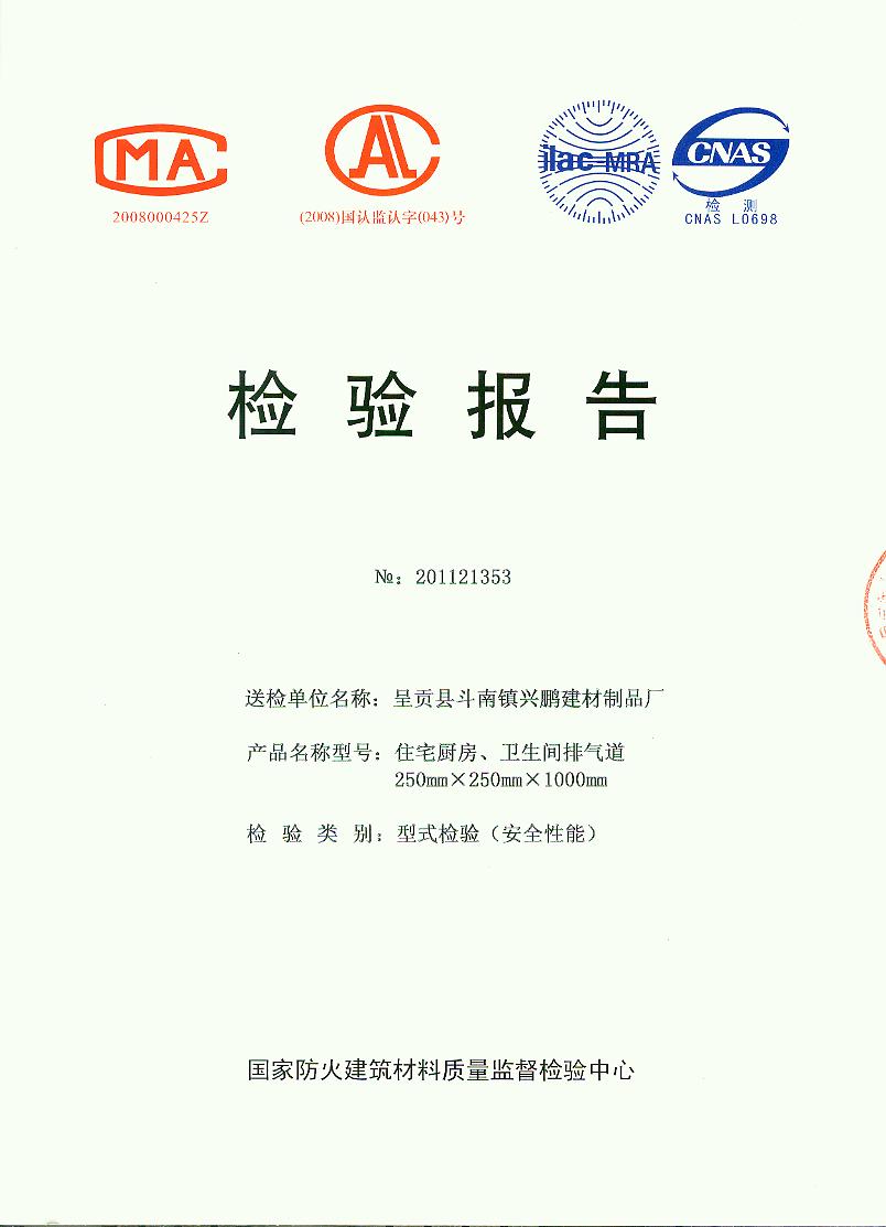 经检验,该250mm×250mm×1000mm型住房厨房、卫生间排气道耐火性能为1.0h,符合标准规定要求。 按JG/T 194-2006《住宅厨房、卫生间排气道》判定,该产品耐火性能合格。 (以下空白)