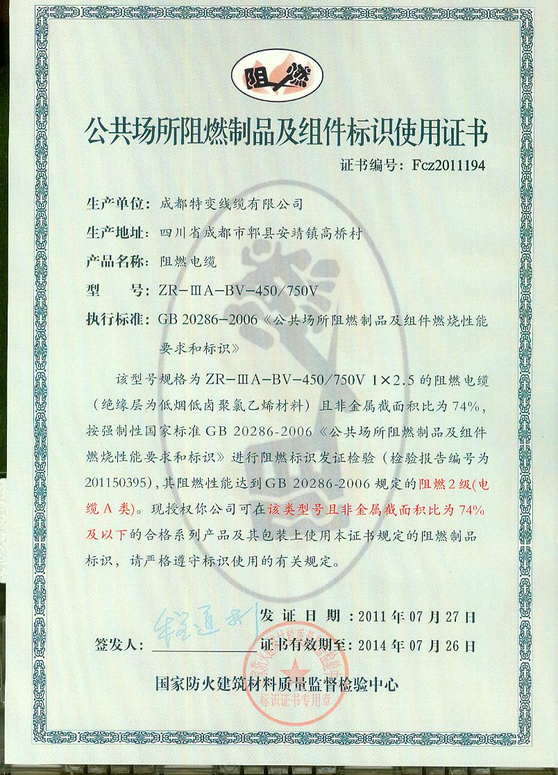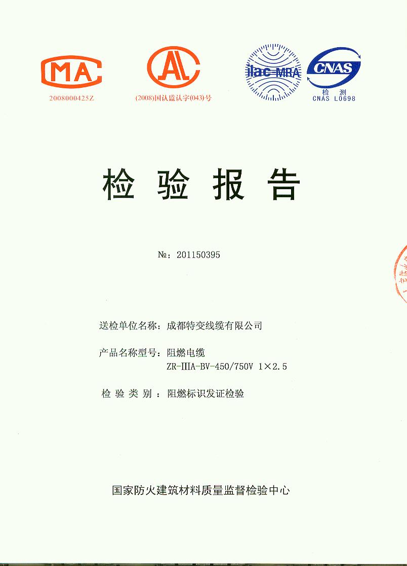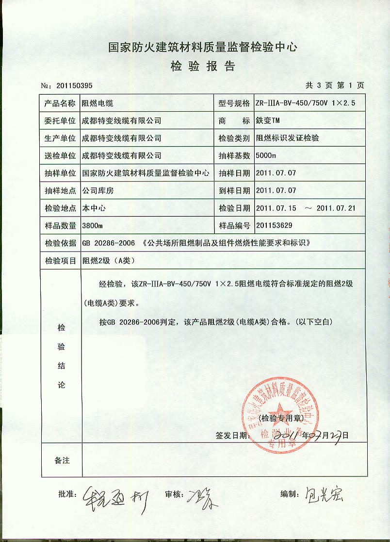 经检验,该ZR-ⅢA-BV-450/750V 1×2.5阻燃电缆符合标准规定的阻燃2级(电缆A类)要求。按GB 20286-2006判定,该产品阻燃2级(电缆A类)合格。(以下空白)