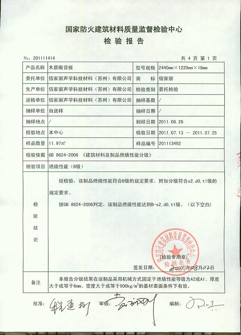 经检验,该制品燃烧性能符合B级的规定要求,附加分级符合s2,d0,t1级的规定要求。 按GB 8624-2006判定,该制品燃烧性能达到B-s2,d0,t1级。(以下空白)