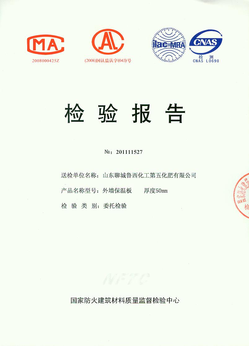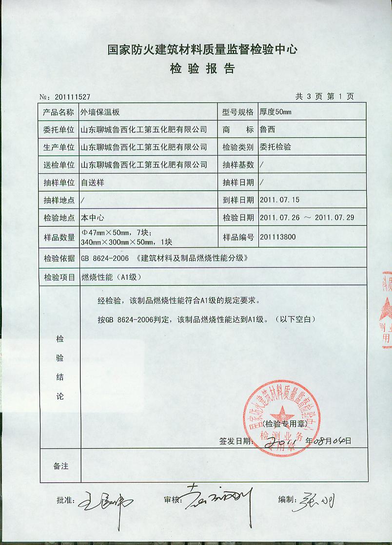 经检验,该制品燃烧性能符合A1级的规定要求。按GB 8624-2006判定,该制品燃烧性能达到A1级。(以下空白)