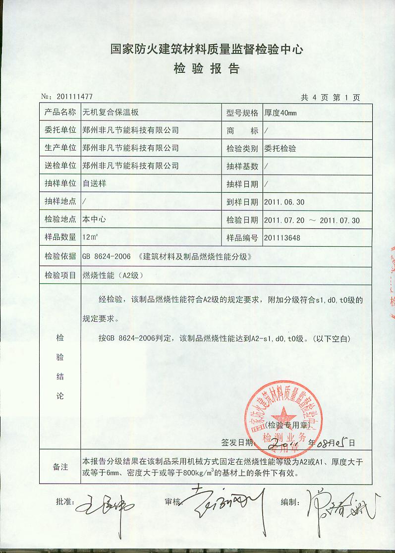 经检验,该制品燃烧性能符合A2级的规定要求,附加分级符合s1,d0,t0级的 规定要求。 按GB 8624-2006判定,该制品燃烧性能达到A2-s1,d0,t0级。(以下空白)