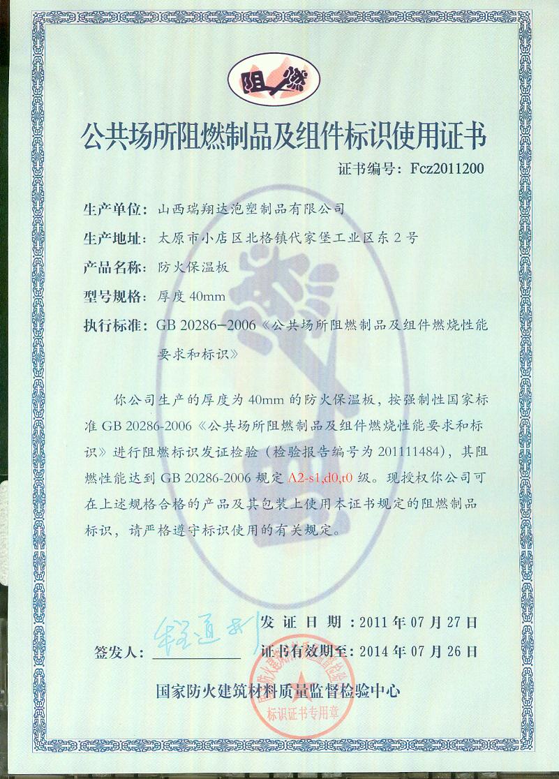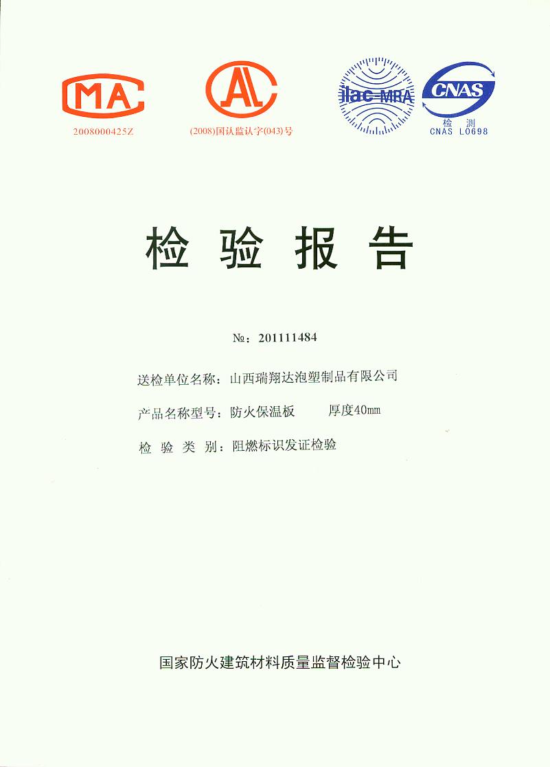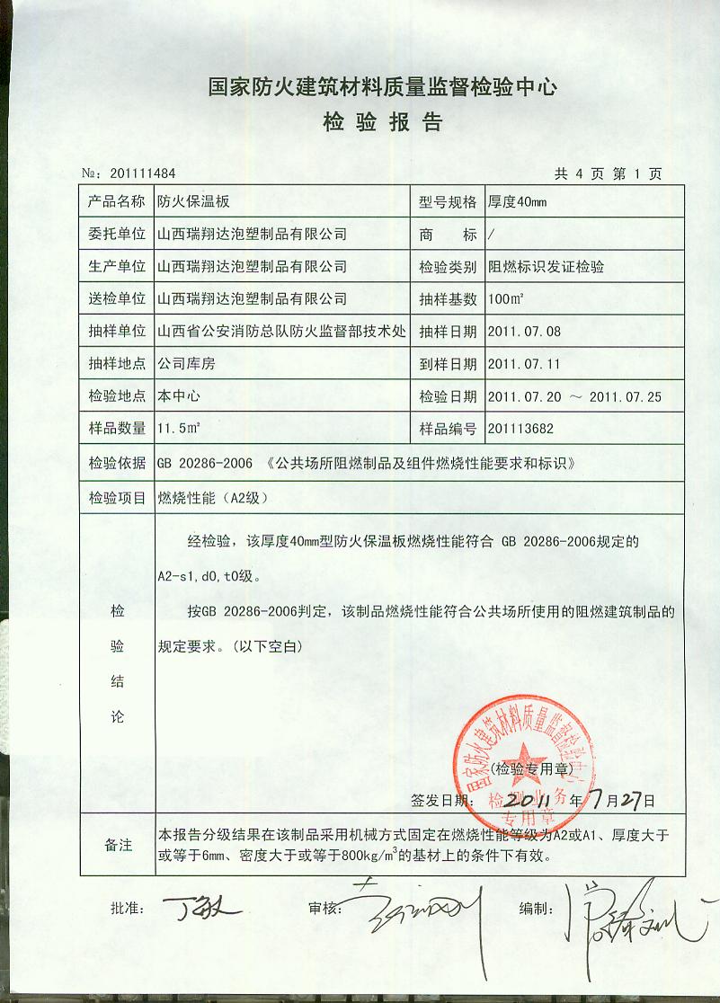 经检验,该厚度40mm型防火保温板燃烧性能符合 GB 20286-2006规定的A2-s1,d0,t0级。 按GB 20286-2006判定,该制品燃烧性能符合公共场所使用的阻燃建筑制品的规定要求。(以下空白)