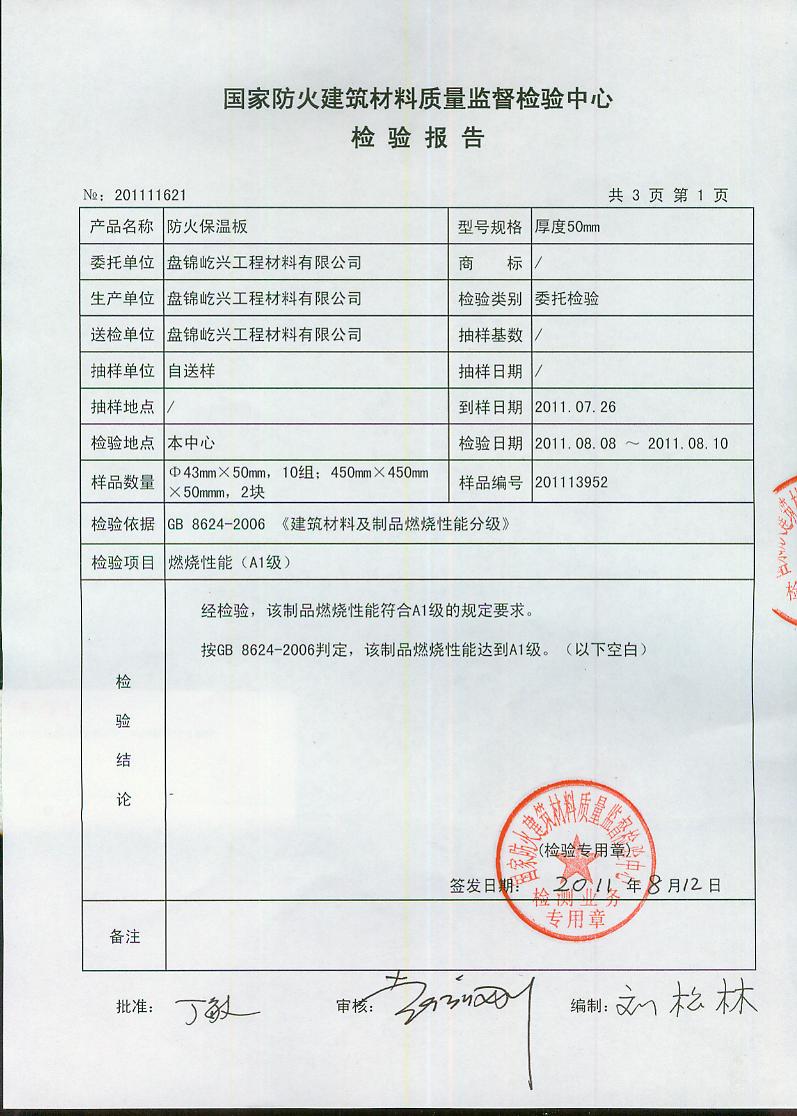 经检验,该制品燃烧性能符合A1级的规定要求。按GB 8624-2006判定,该制品燃烧性能达到A1级。(以下空白)
