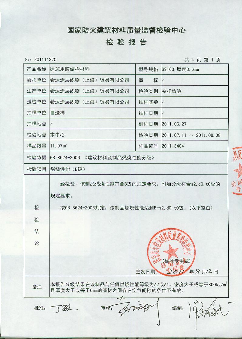 经检验,该制品燃烧性能符合B级的规定要求,附加分级符合s2,d0,t0级的 规定要求。 按GB 8624-2006判定,该制品燃烧性能达到B-s2,d0,t0级。(以下空白)