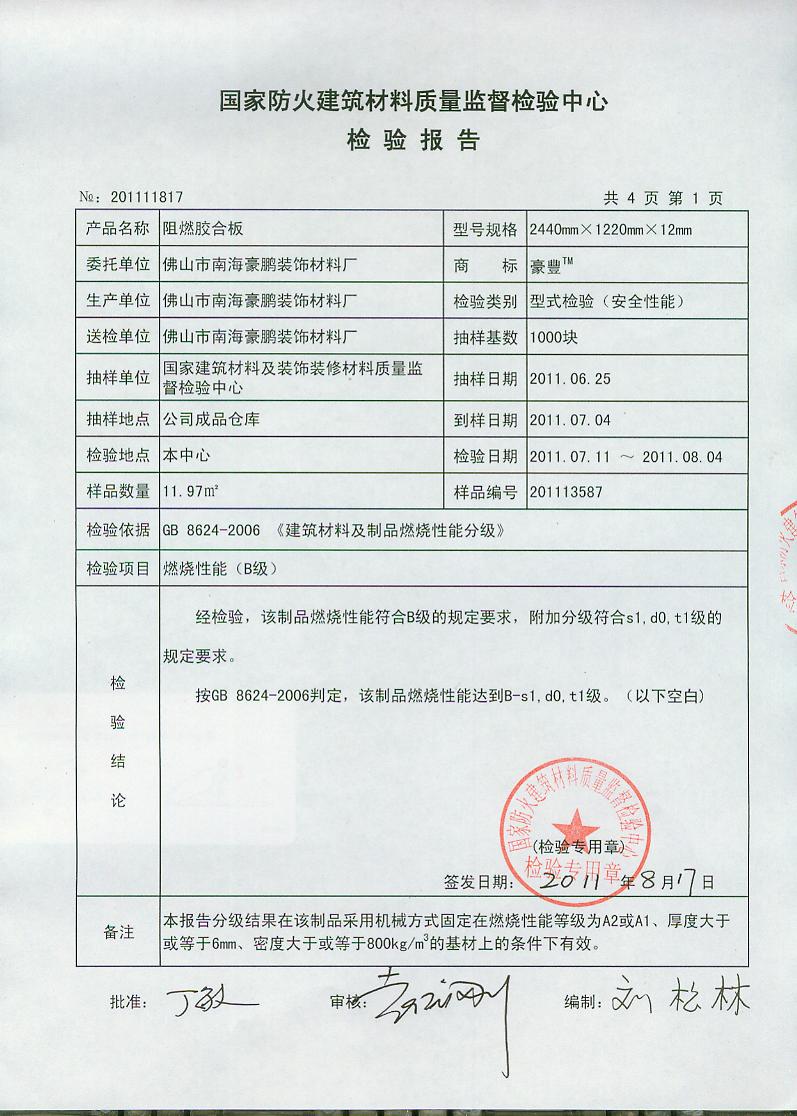 经检验,该制品燃烧性能符合B级的规定要求,附加分级符合s1,d0,t1级的规定要求。按GB 8624-2006判定,该制