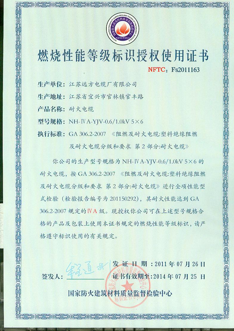 经检验,该NH-ⅣA-YJV-0.6/1.0kV 5×6耐火电缆耐火性能符合ⅣA级规定要求,其它各项技术指标均合格。按GA 306.2-2007综合判定,该产品质量合格。 (以下空白)