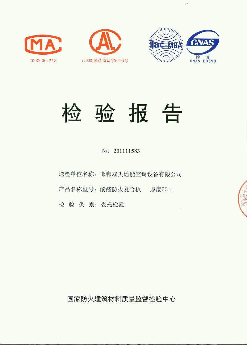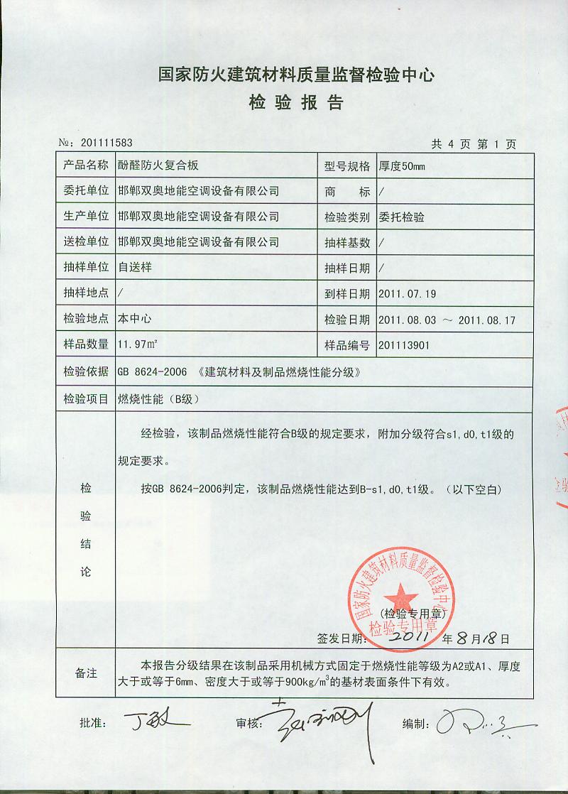经检验,该制品燃烧性能符合B级的规定要求,附加分级符合s1,d0,t1级的规定要求。 按GB 8624-2006判定,该制品燃烧性能达到B-s1,d0,t1级。(以下空白)