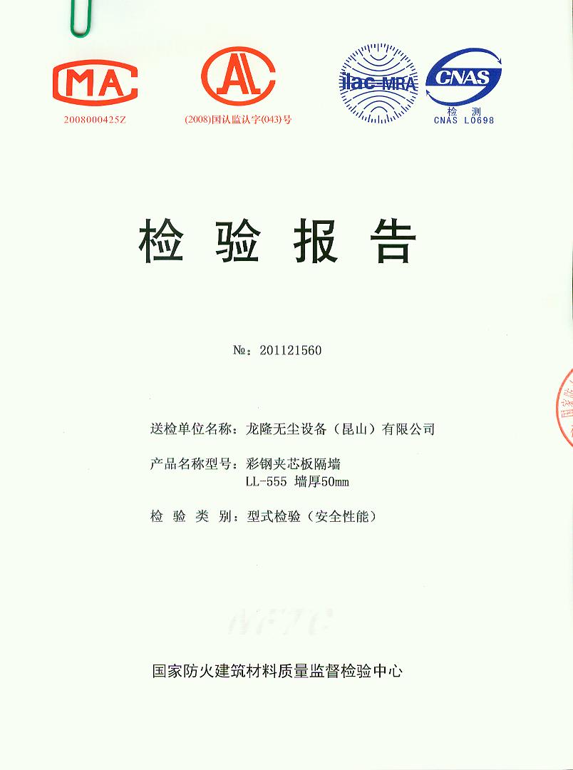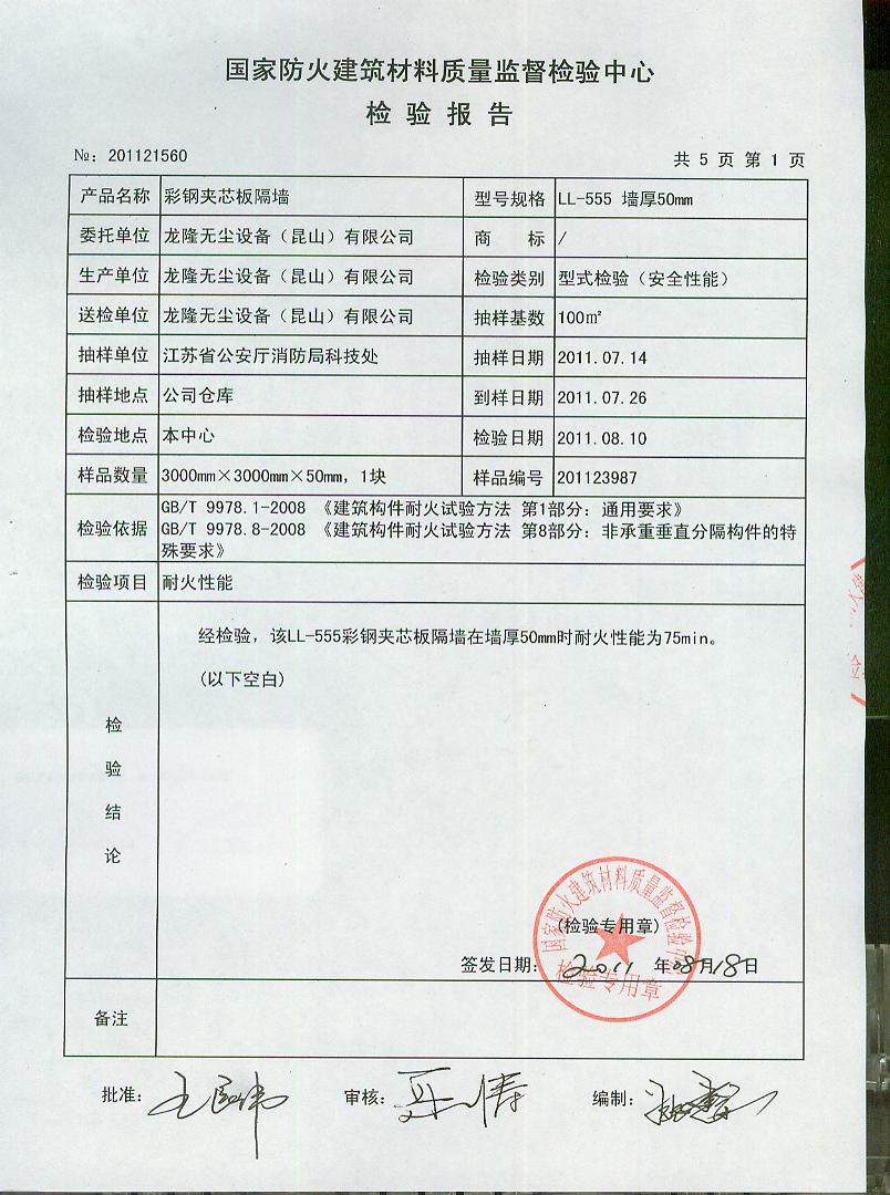 经检验,该LL-555彩钢夹芯板隔墙在墙厚50mm时耐火性能为75min。