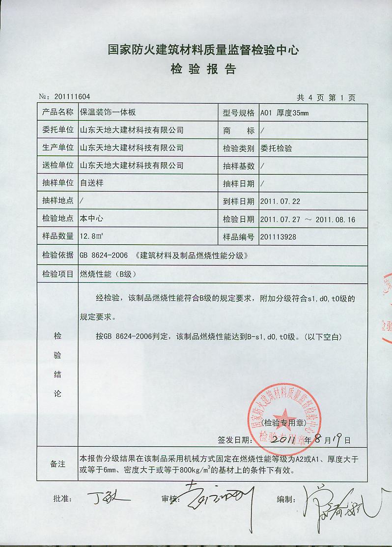 经检验,该制品燃烧性能符合B级的规定要求,附加分级符合s1,d0,t0级的 规定要求。 按GB 8624-2006判定,该制品燃烧性能达到B-s1,d0,t0级。(以下空白)