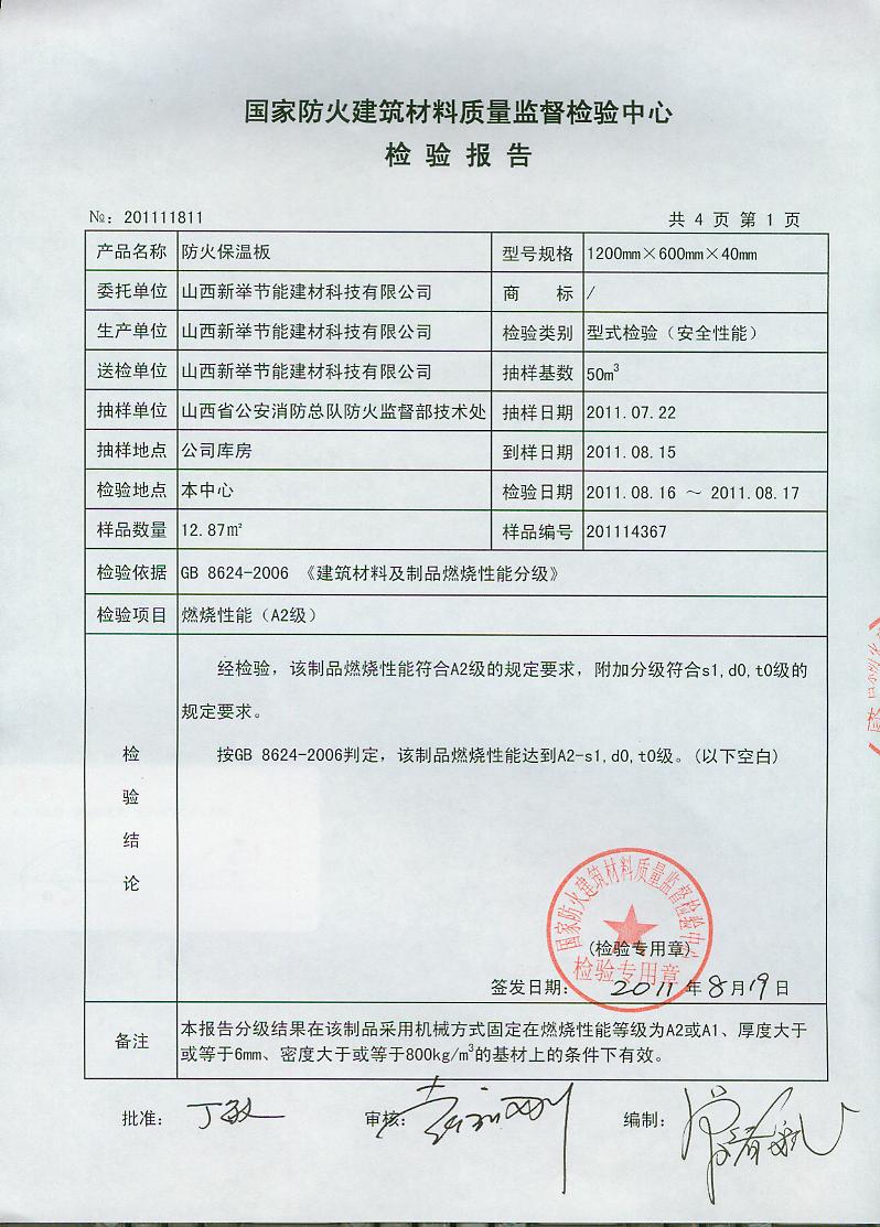 经检验,该制品燃烧性能符合A2级的规定要求,附加分级符合s1,d0,t0级的 规定要求。 按GB 8624-2006判定,该制品燃烧性能达到A2-s1,d0,t0级。(以下空白)