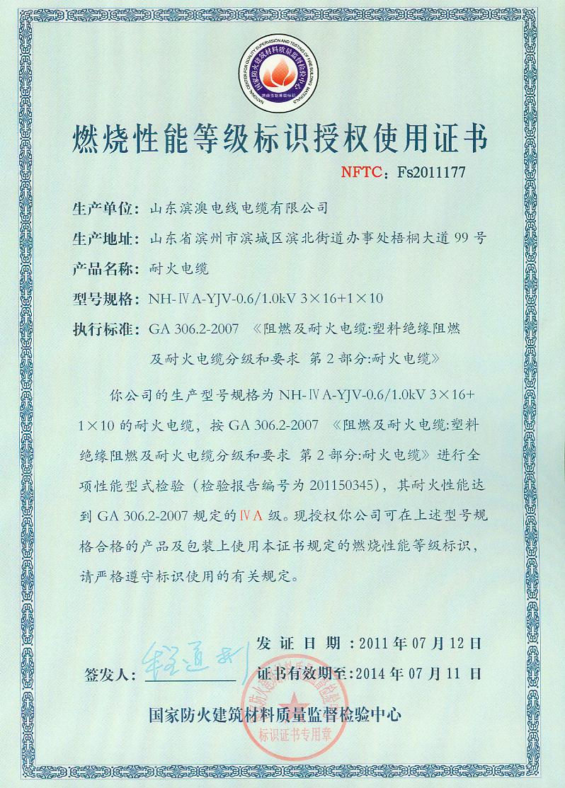 经检验,该NH-ⅣA-YJV-0.6/1.0kV 3×16+1×10耐火电缆耐火 性能符合ⅣA级规定要求,其它各项技术指标均合格。按GA 306.2-2007综合判定,该产品质量合格。(以下空白)