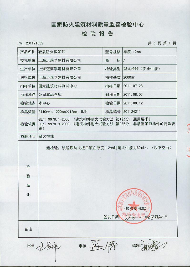 经检验,该轻质防火板吊顶在厚度112mm时耐火性能为60min。