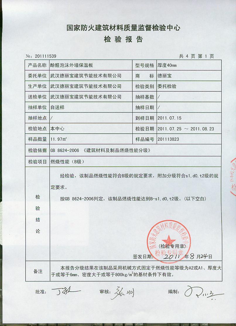 经检验,该制品燃烧性能符合B级的规定要求,附加分级符合s1,d0,t2级的规定要求。按GB 8624-2006判定,该制品燃烧性能达到B-s1,d0,t2级。(以下空白)