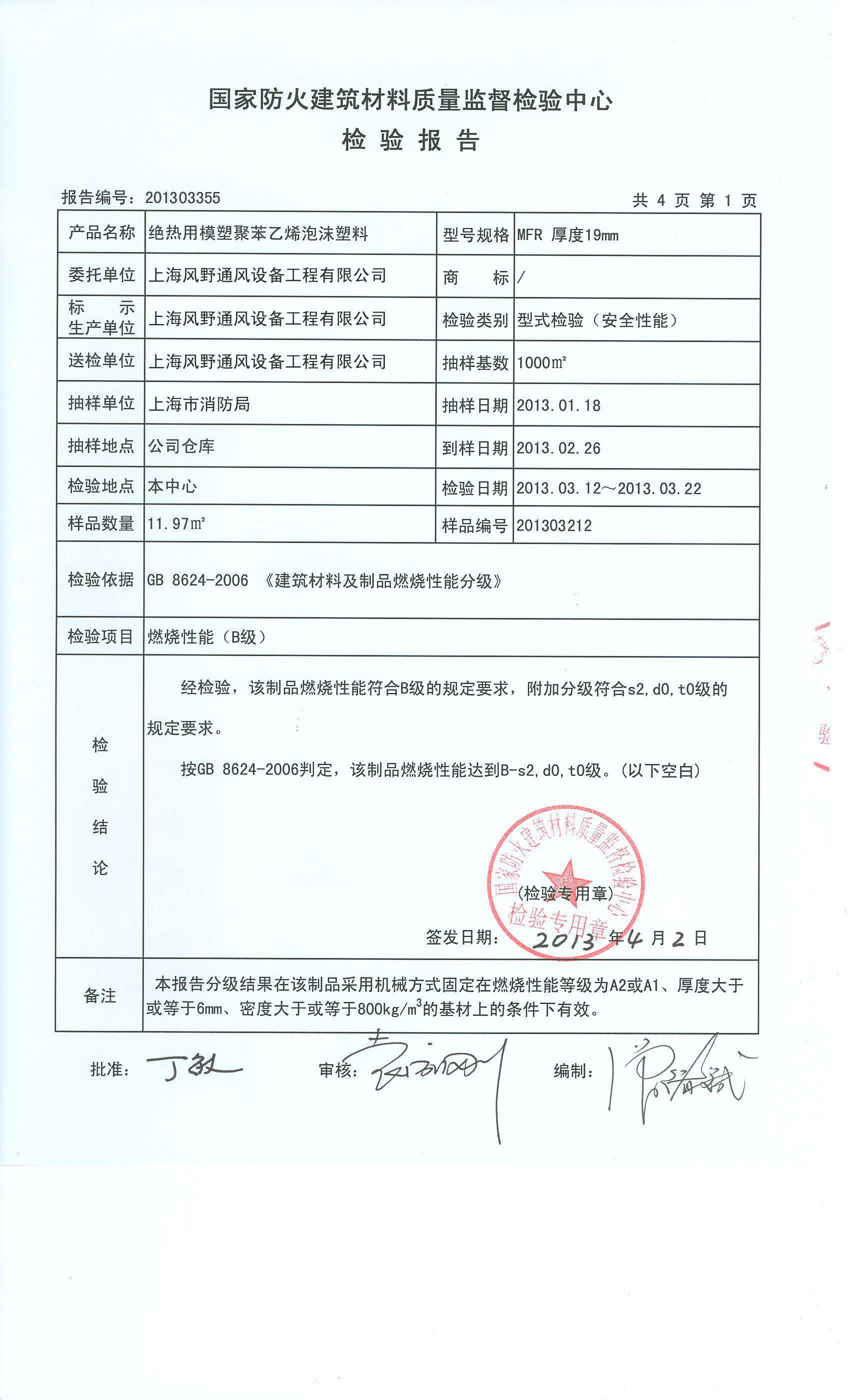 经检验,该制品燃烧性能符合B级的规定要求,附加分级符合s2,d0,t0级的规定要求。按GB 8624-2006判定,该制品燃烧性能达到B-s2,d0,t0级。(以下空白)