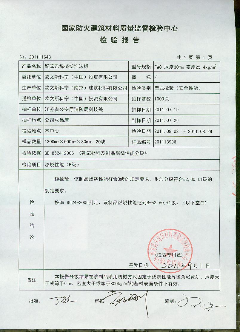 经检验,该制品燃烧性能符合B级的规定要求,附加分级符合s2,d0,t1级的规定要求。按GB 8624-2006判定,该制品燃烧性能达到B-s2,d0,t1级。(以下空白)