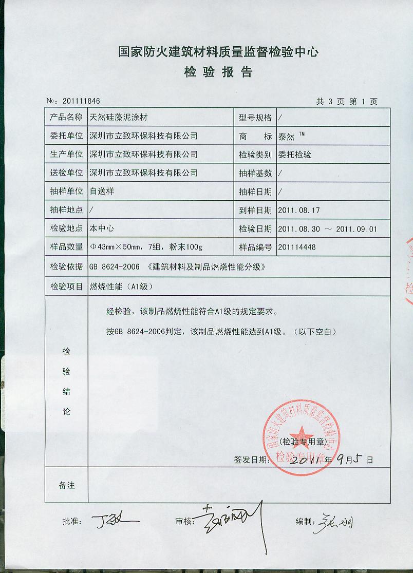 经检验,该制品燃烧性能符合A1级的规定要求。按GB 8624-2006判定,该制品燃烧性能达到A1级。(以下空白)