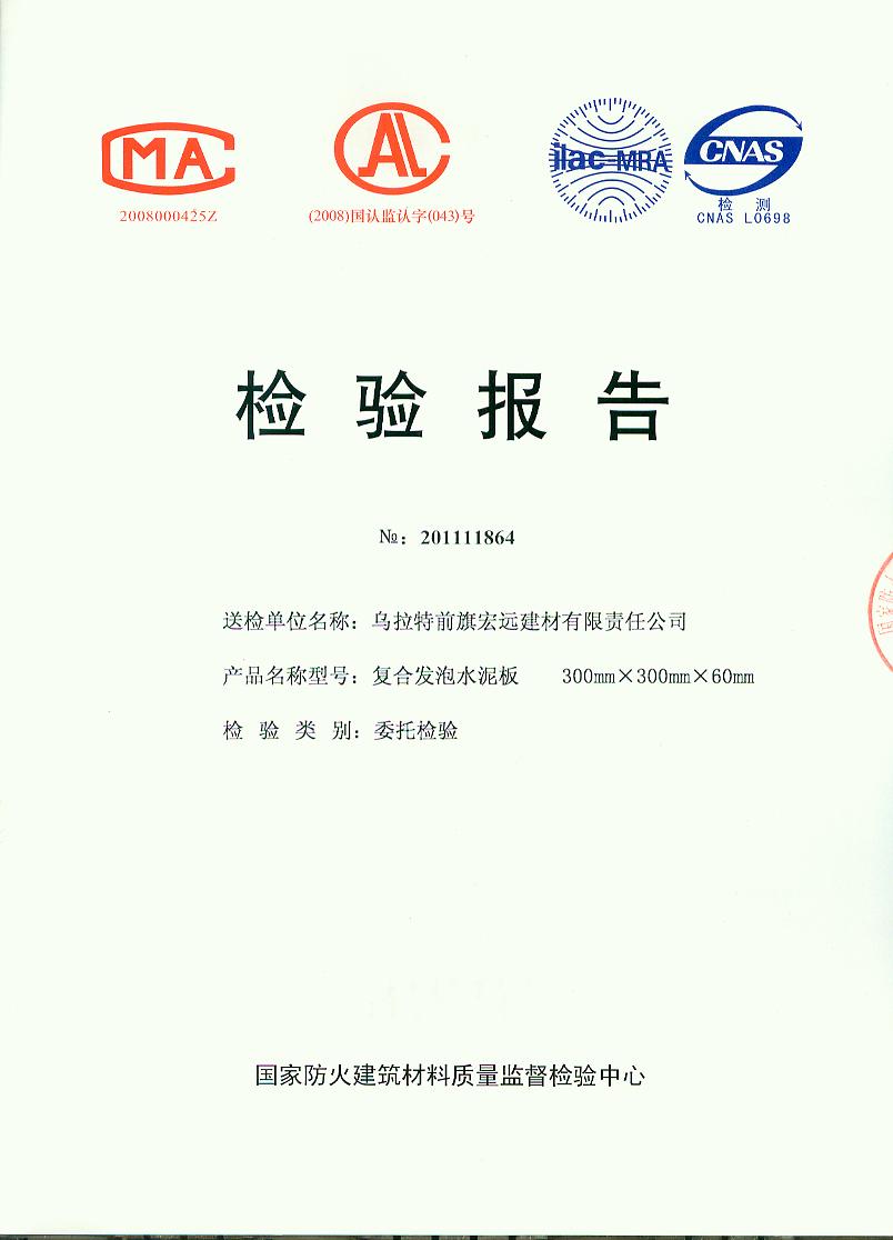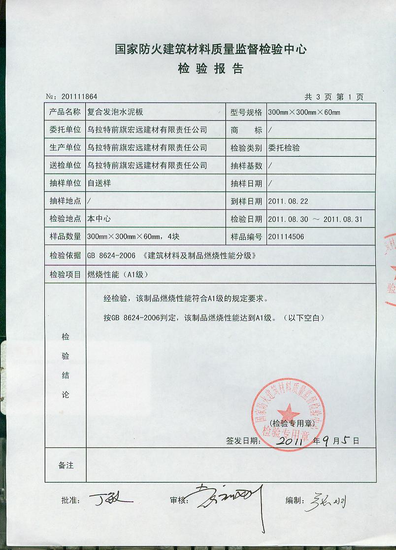 经检验,该制品燃烧性能符合A1级的规定要求。按GB 8624-2006判定,该制品燃烧性能达到A1级。(以下空白)
