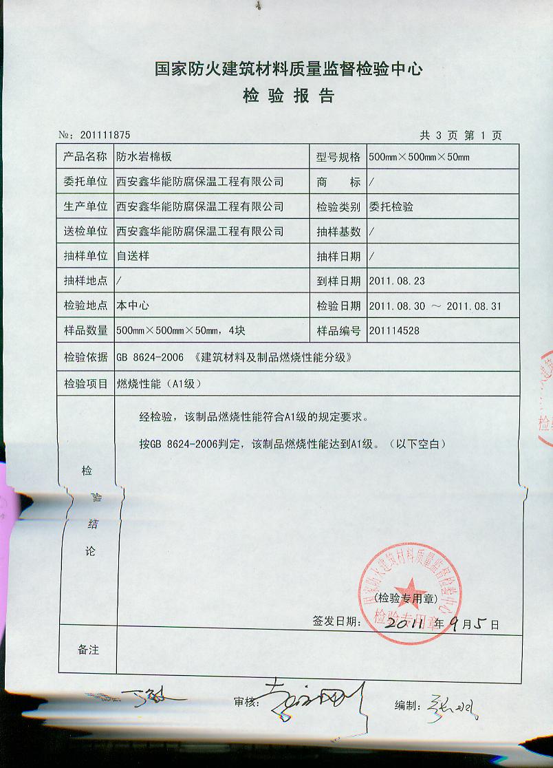 经检验,该制品燃烧性能符合A1级的规定要求。按GB 8624-2006判定,该制品燃烧性能达到A1级。(以下空白)