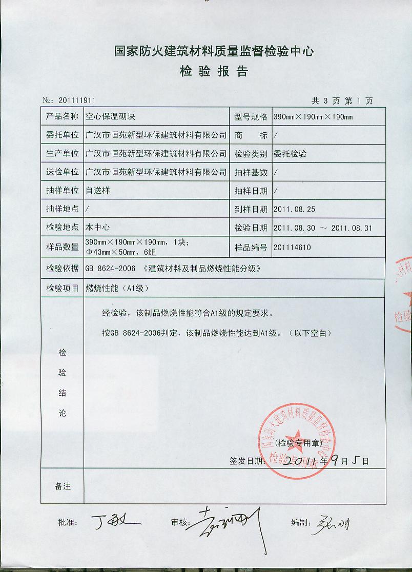 经检验,该制品燃烧性能符合A1级的规定要求。按GB 8624-2006判定,该制品燃烧性能达到A1级。(以下空白)