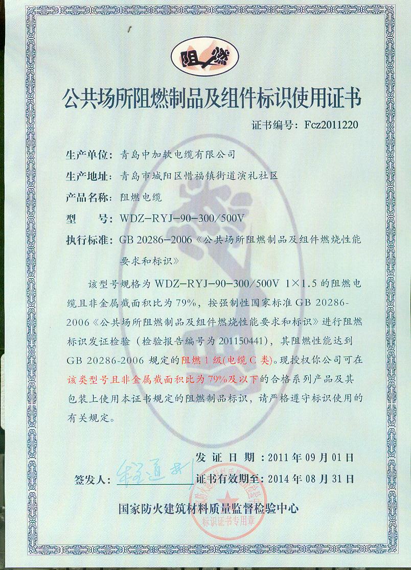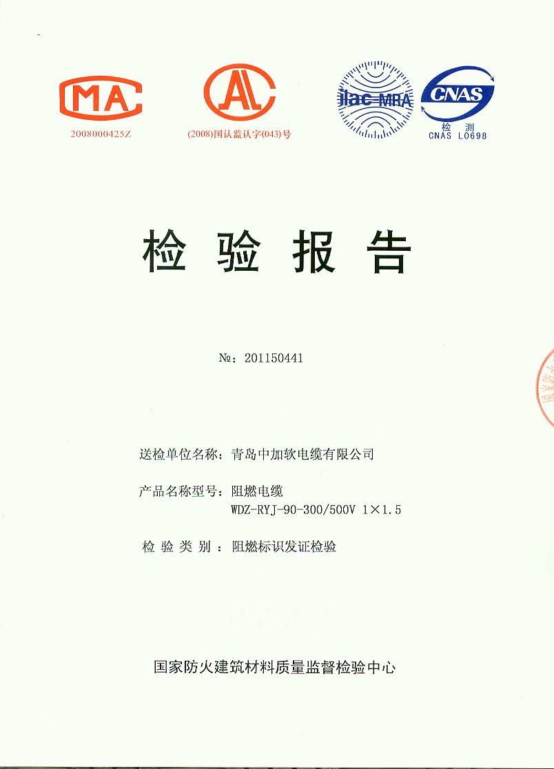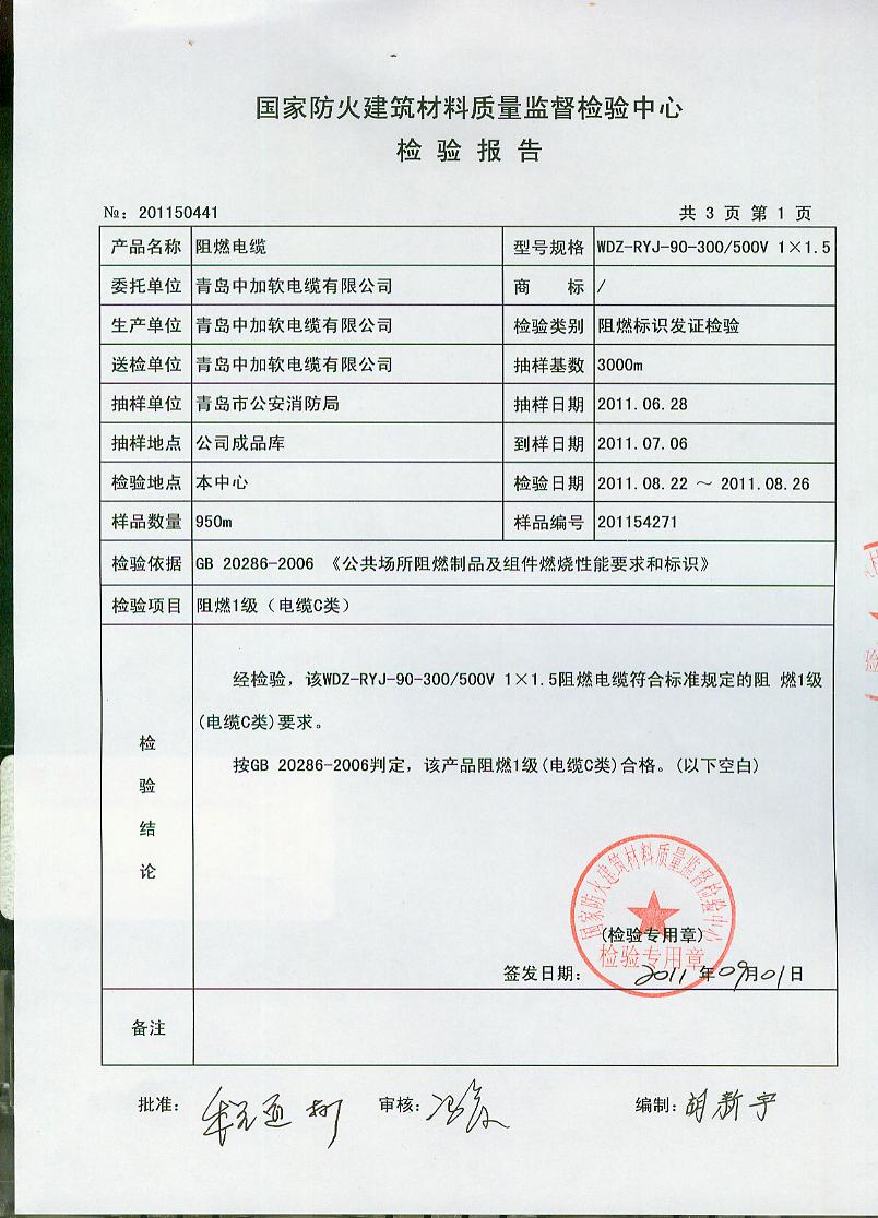 经检验,该WDZ-RYJ-90-300/500V 1×1.5阻燃电缆符合标准规定的阻燃1级(电缆C类)要求。 按GB 20286-2006判定,该产品阻燃1级(电缆C类)合格。(以下空白)